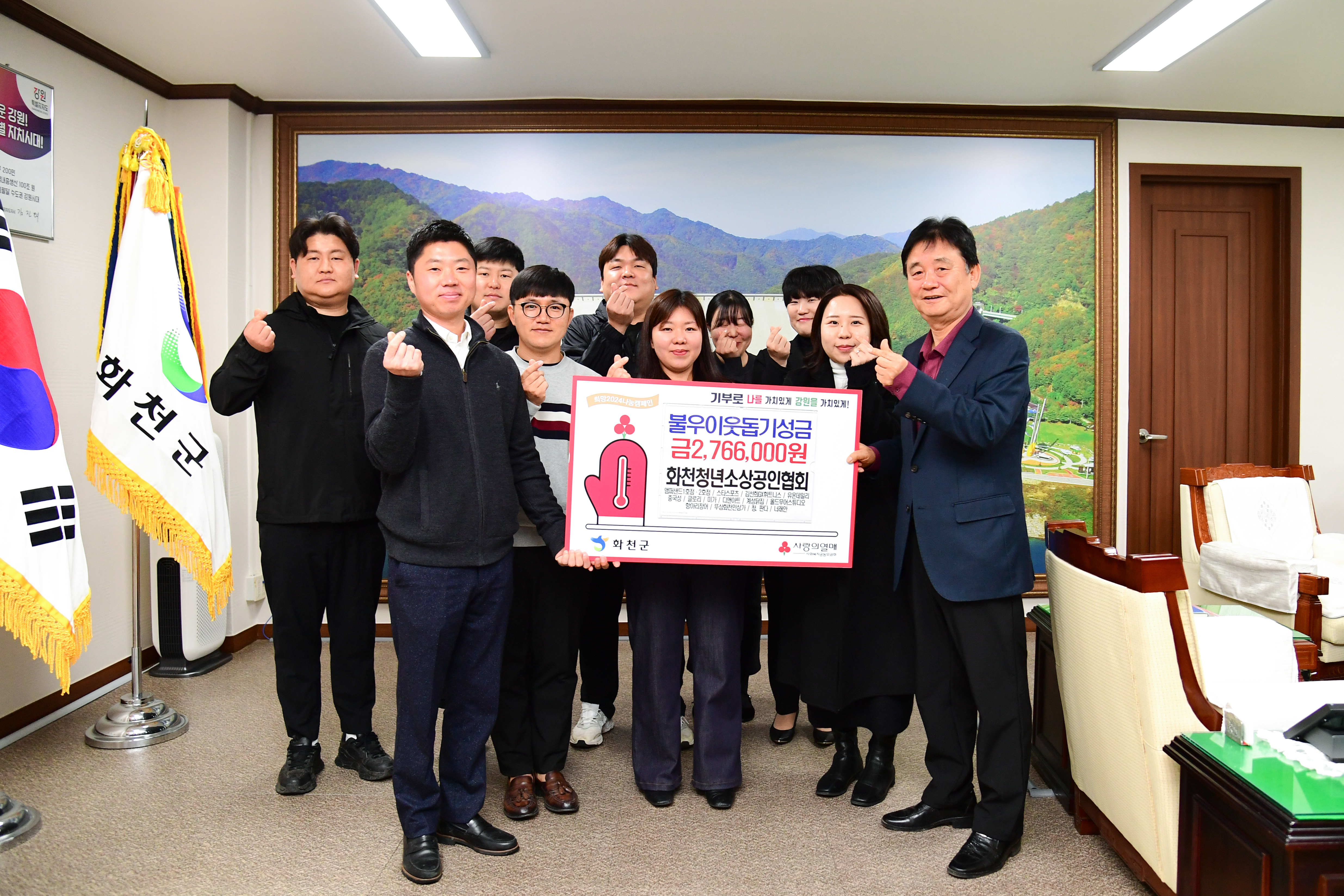 화천청년소상공인연합회(회장:이종원) 회원들은 지난 2월 15일 최문순 화천군수를 방문해 이웃돕기 성금 276만6,000원을 기탁했다.
