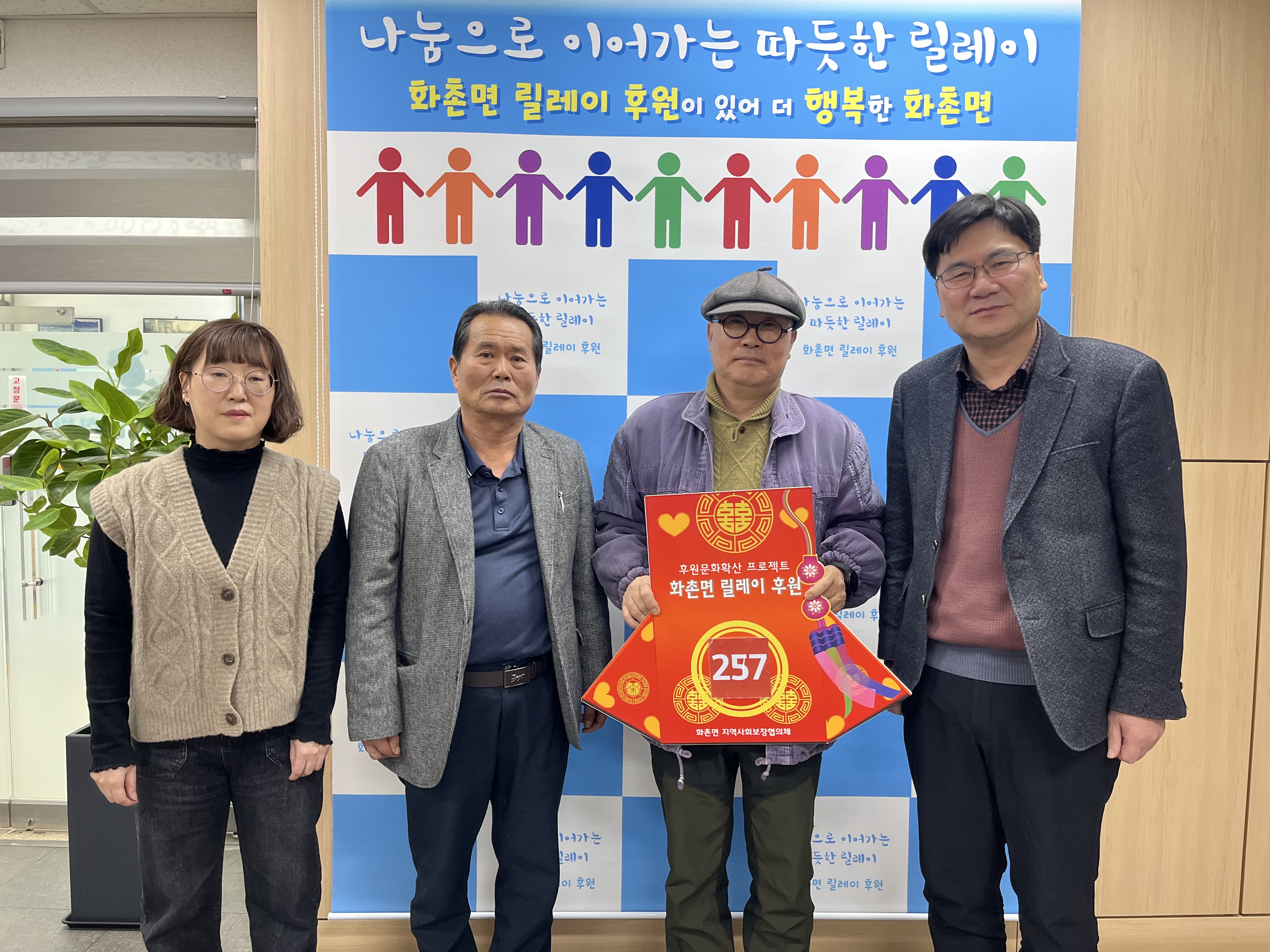 홍천군 화촌면 지역사회보장협의체에서 후원문화 확산을 위해 진행하고 있는 '화촌면 릴레이 후원'에 후원자들의 온정의 손길이 이어지고 있다. 박종준 송정리 이장은 지난 2월 16일 화촌면 행정복지센터를 방문해 관내 어려운 이웃을 위해 사용해 달라며 화촌면 릴레이 후원 257번째 주자로 참여하고 후원금을 기탁했다. 지...