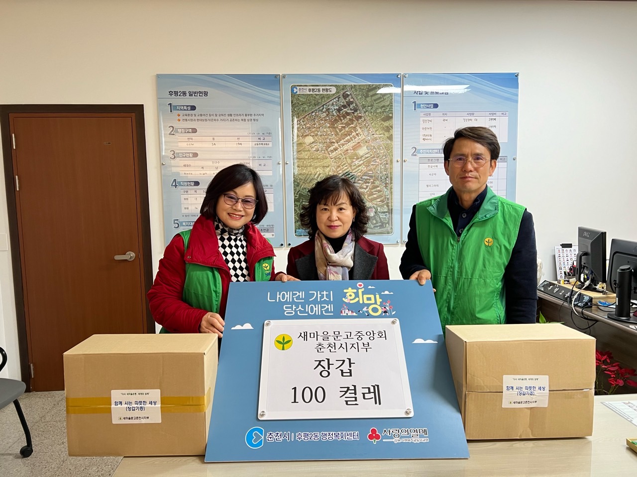 새마을문고중앙회 춘천시지부(회장 이희순)는 지난 2월 16일 춘천시 후평2동 행정복지센터(동장 이명숙)를 방문해 저소득 취약계층을 위한 장갑 100켤레를 전달했다.