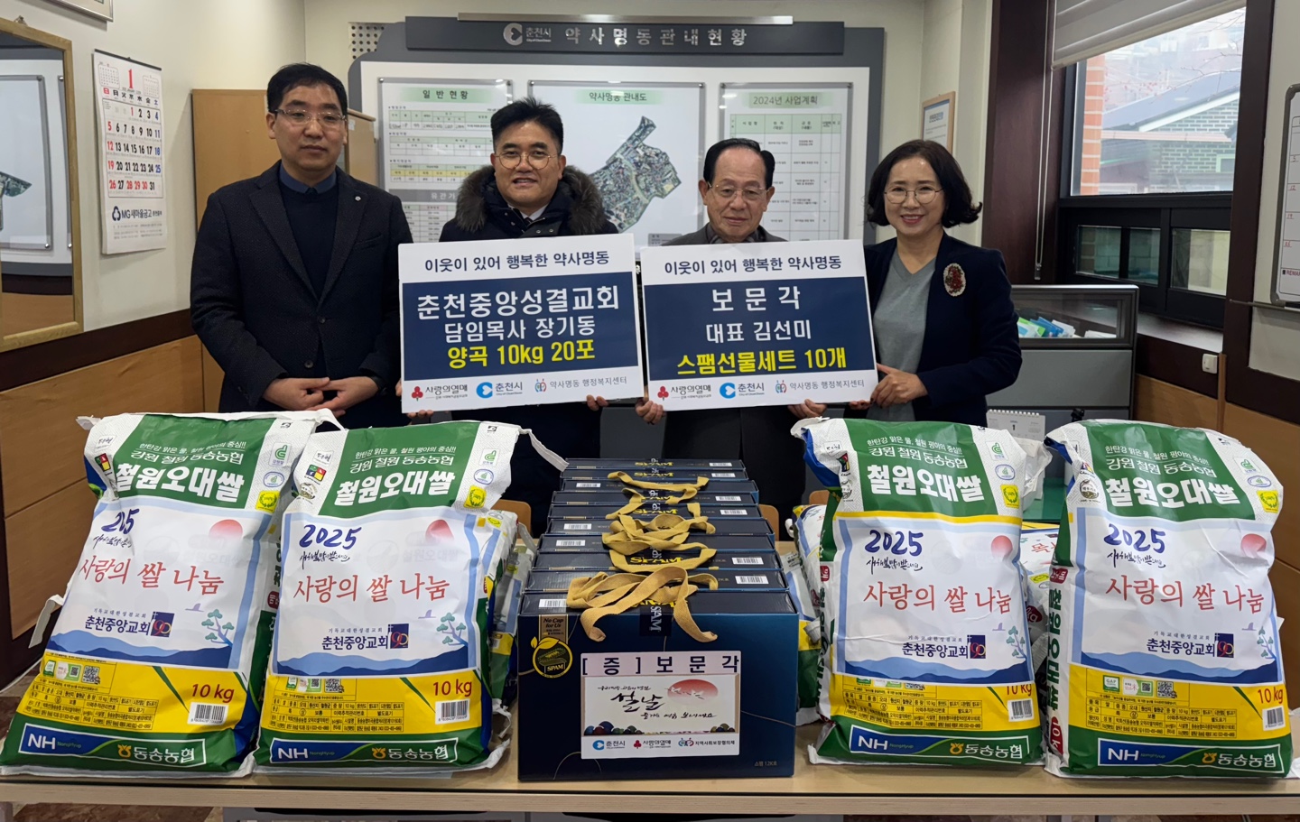 춘천중앙성결교회(담임목사 장기동), 보문각(대표 김선미)은 1월 21일 설 명절을 앞두고 약사명동 지역사회보장협의체(위원장 신진태)에 물품을 전달했다.
