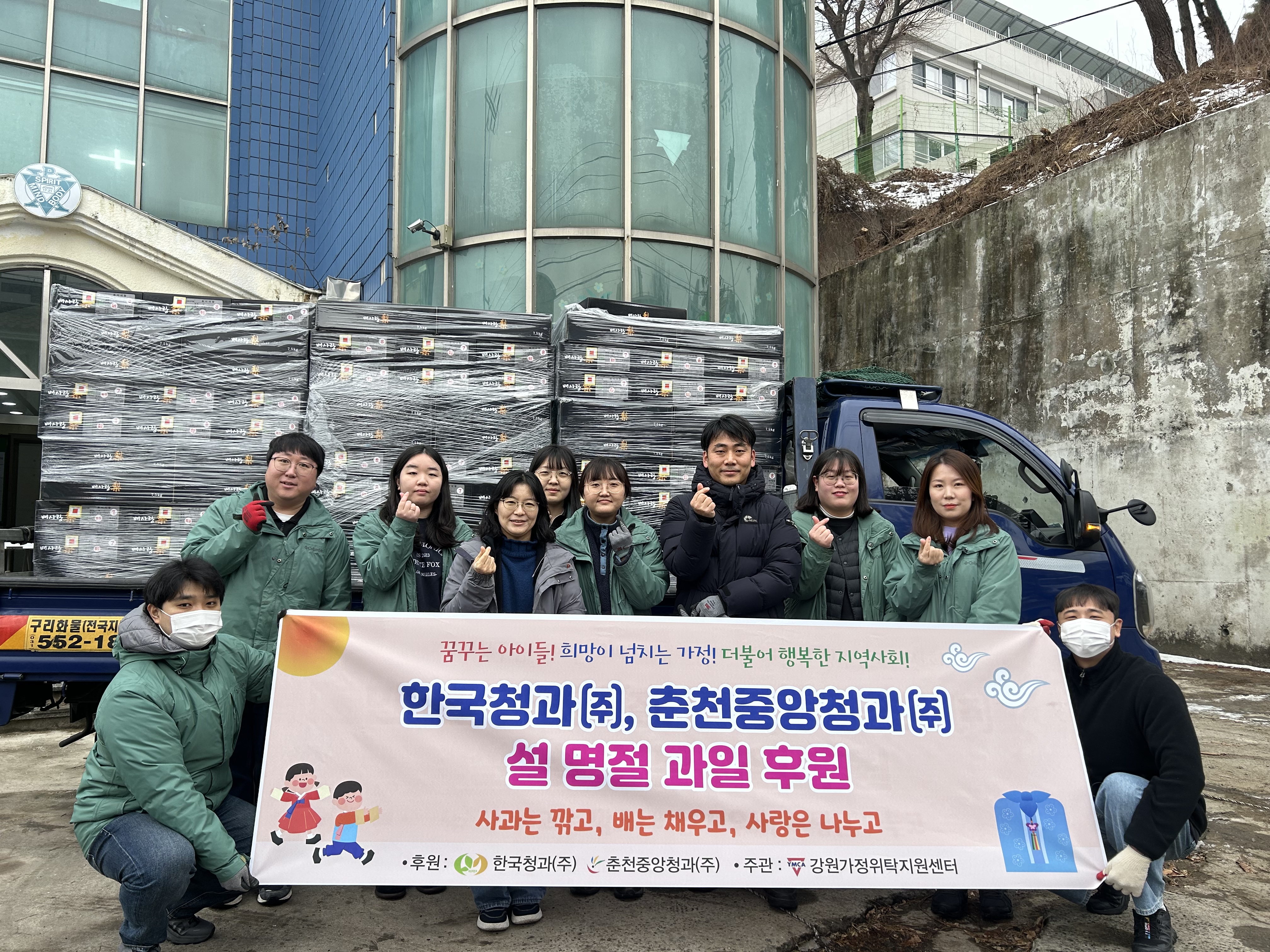2025년 1월 20일(월) 11시, 한국청과(주)·춘천중앙청과(주) (대표이사 박상헌)는 다가오는 설을 맞이하여 강원특별자치도 내 위탁가정에 명절선물을 전달해달라며 강원가정위탁지원센터(관장 장미희)에 과일 400박스(1,500만원 상당)를 후원하였다. 한국청과(주)·춘천중앙청과(주)는 고물가 상황에서 과일값 상승으로 위탁...