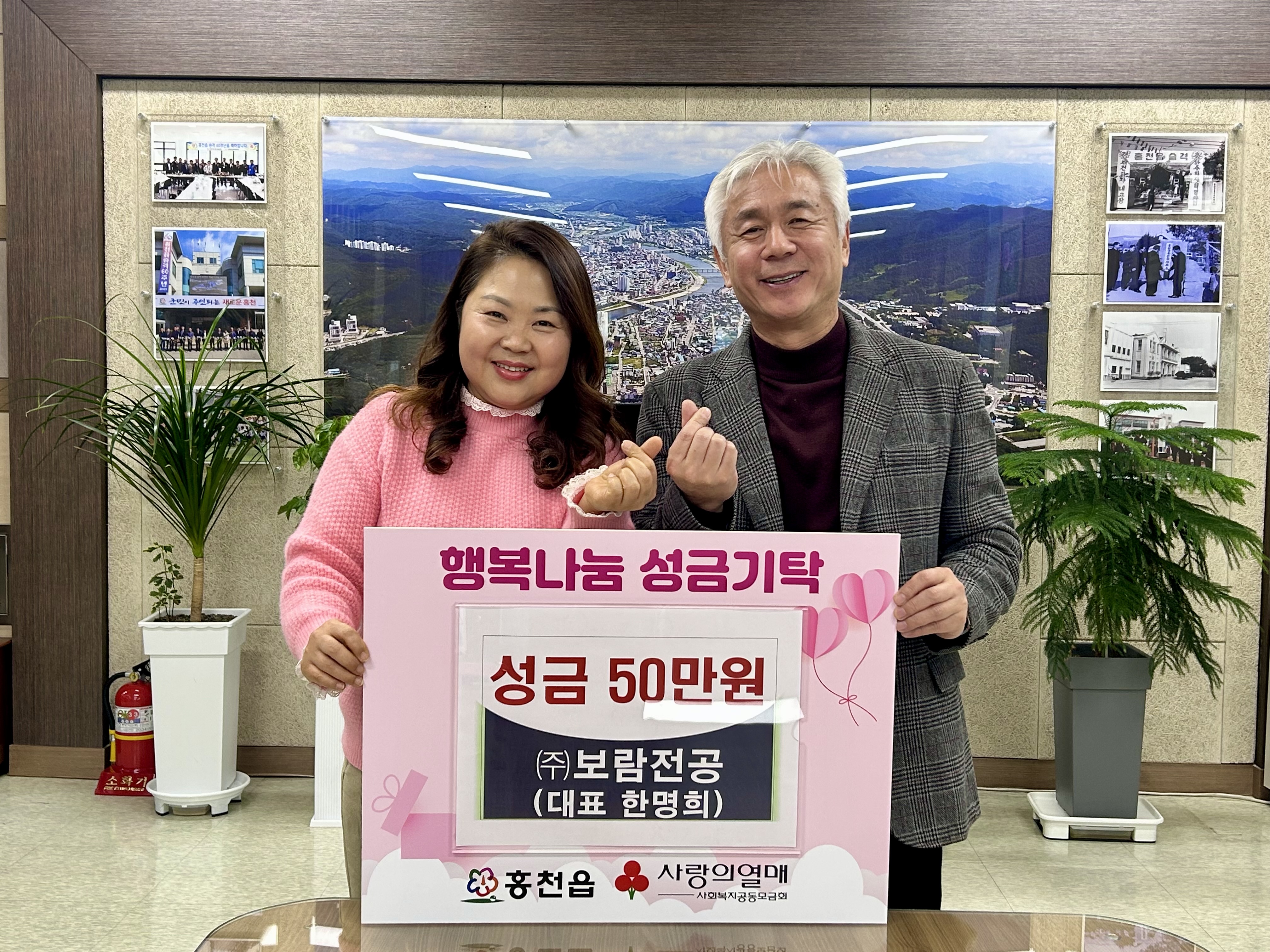 (주)보람전공(대표 한명희)는 1월 21일 홍천읍행정복지센터를 방문해 이웃돕기 성금 50만 원을 기탁했다.