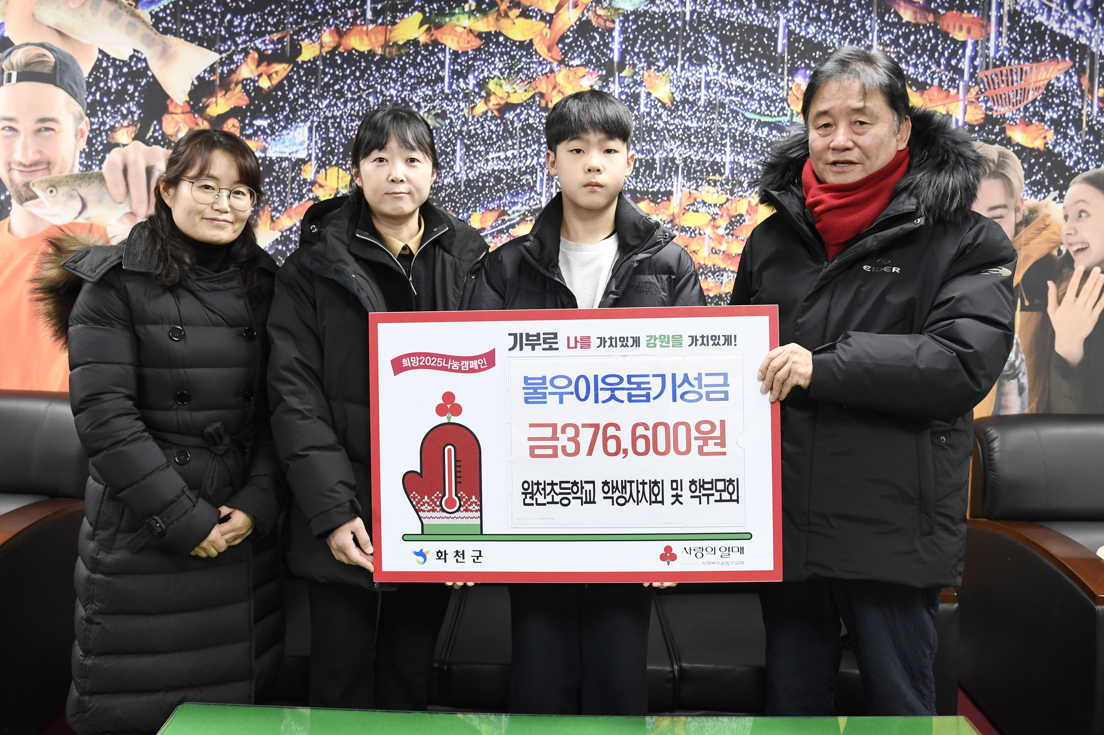 화천 원천초등학교 학생 자치회, 학부모회는 1월 16일 화천산천어축제장을 찾아 최문순 화천군수에게 십시일반 모금한 이웃돕기 성금 376,600원을 기탁했다.