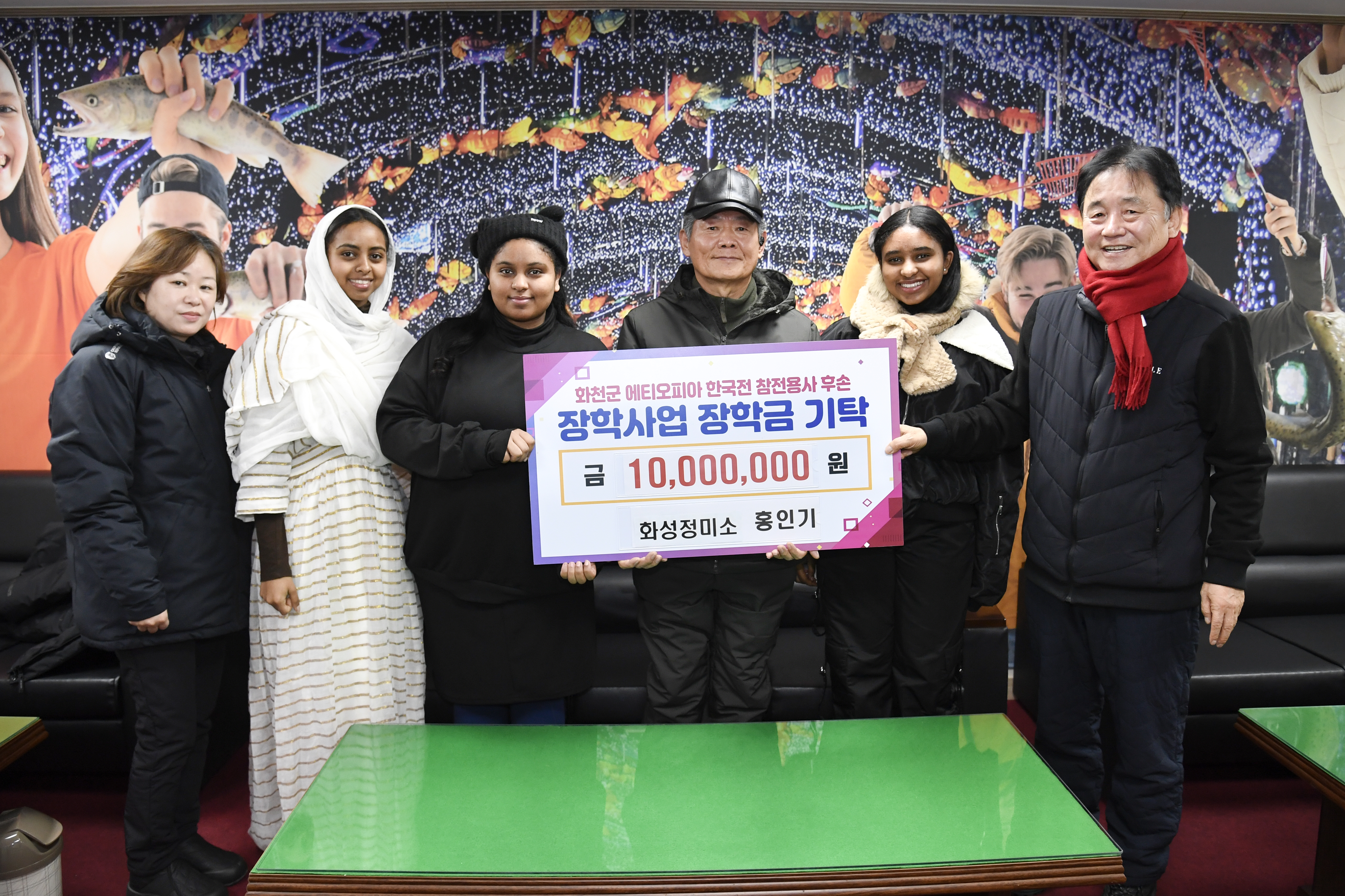 홍인기 화성정미소 대표는 1월 16일 화천산천어축제장을 찾아 최문순 화천군수에게 에티오피아 참전용사 후손 장학금 1,000만원을 기탁했다.