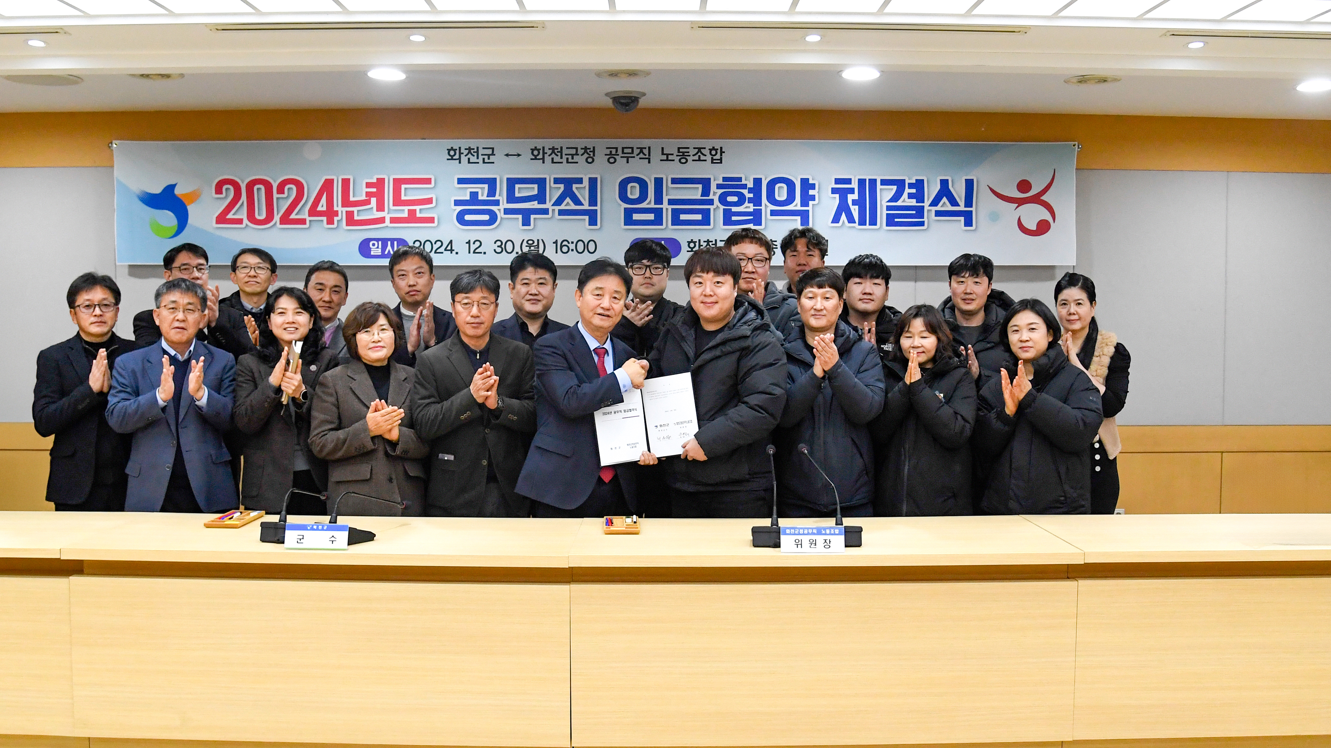 2024년도 화천군청 공무직 임금협약 체결식이 12월 30일 화천군청에서 최문순 화천군수를 비롯해 군청 실과소장 및 공무직 노동조합 관계자들이 참석한 가운데 열렸다.