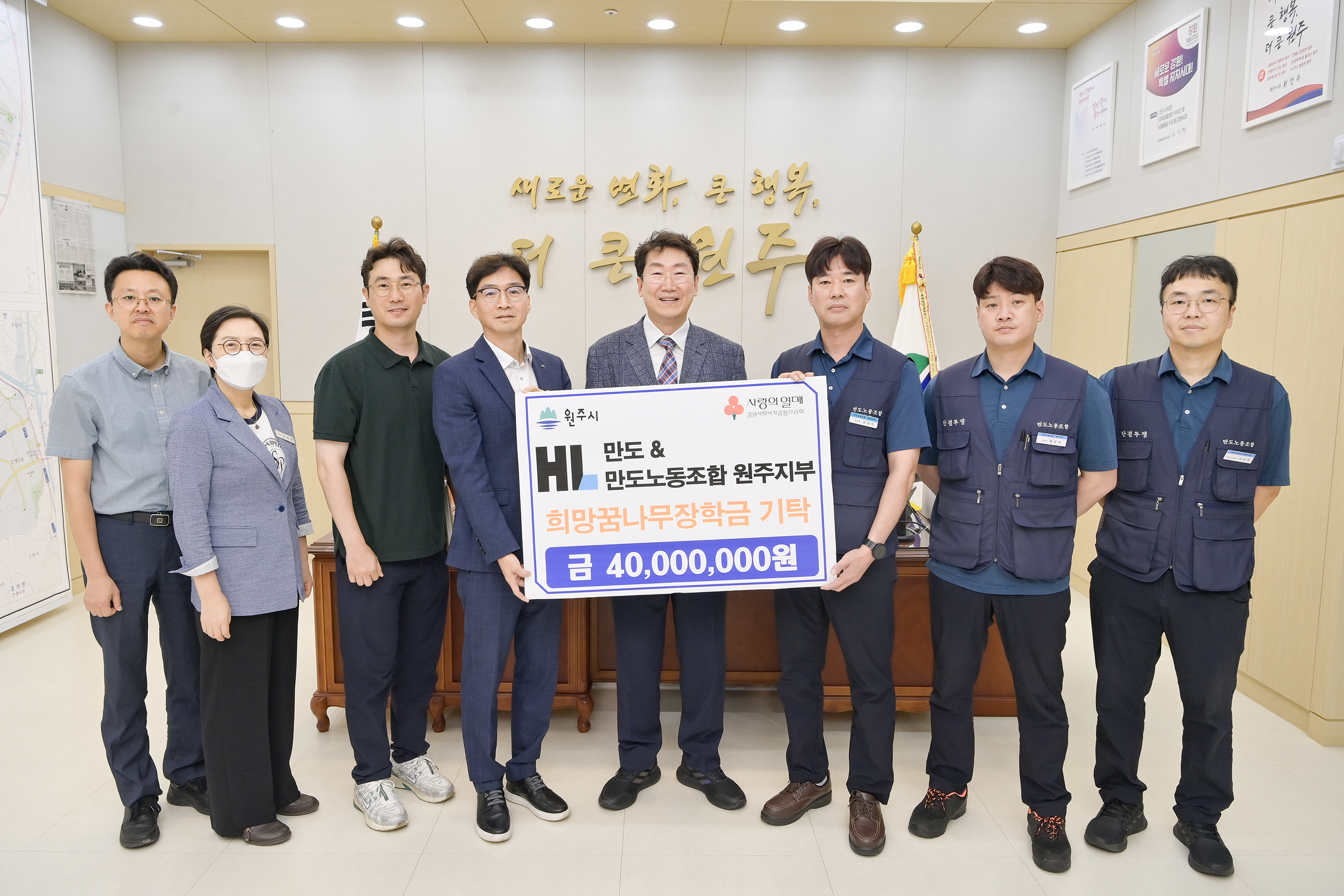 저소득 모범학생 40명에 1백만 원씩 총 4천만 원 지원 HL만도 원주공장(센터장 김흥선)과 HL만도노동조합 원주지부(지부장 김영선)는 지난 8월 22일 오후 2시 30분 원주시장 집무실에서 ‘제11회 희망꿈나무 장학금’ 4천만 원을 전달했다. 이날 전달된 장학금은 원주시와 사회복지공동모금회를 통해 원주 관내 중·고등학교...