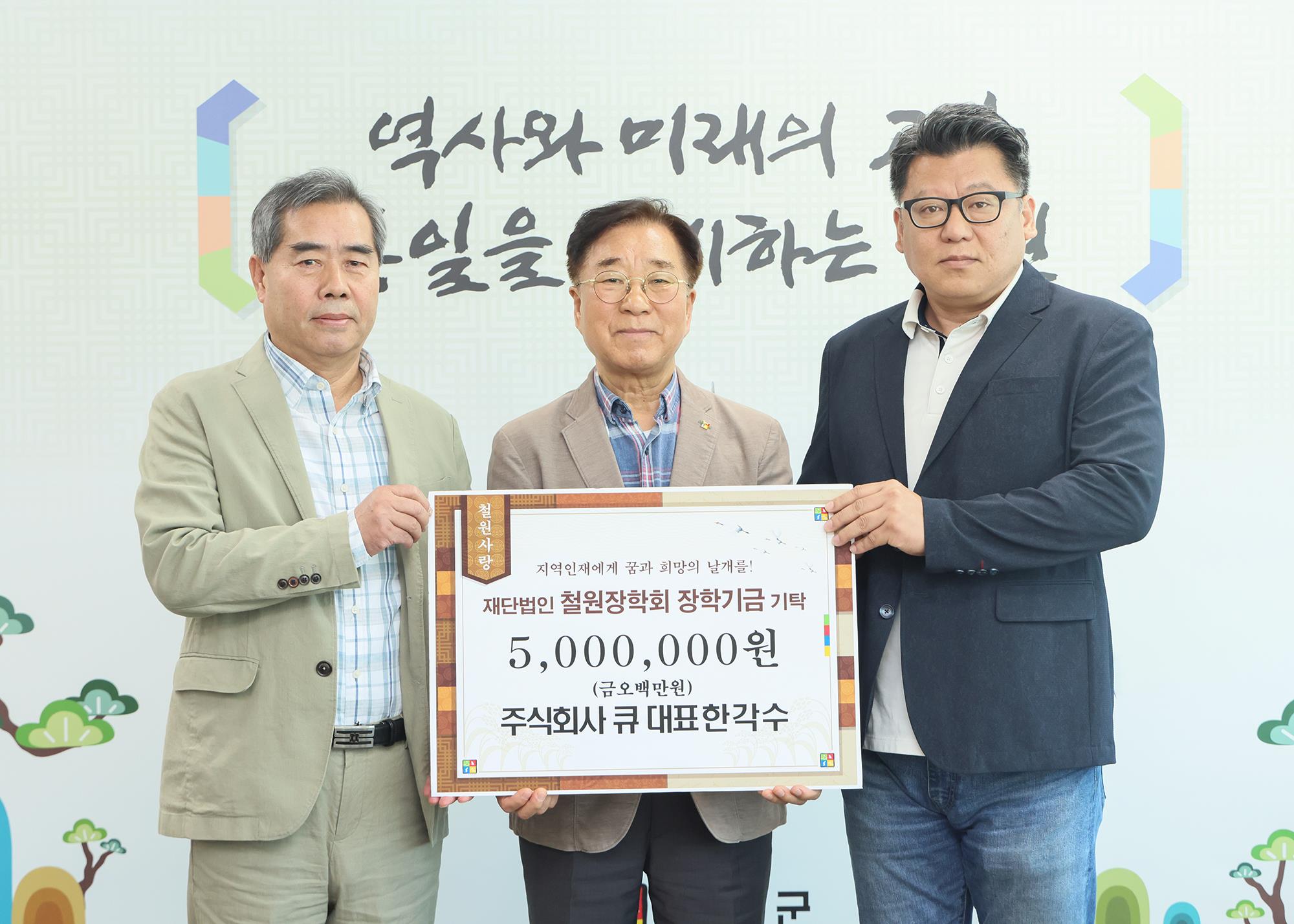 주식회사 큐(대표 한각수)는 지난 4월 9일 오전 10시 30분 철원군청을 방문해 철원장학회 장학기금으로 500만원을 기탁했다.
