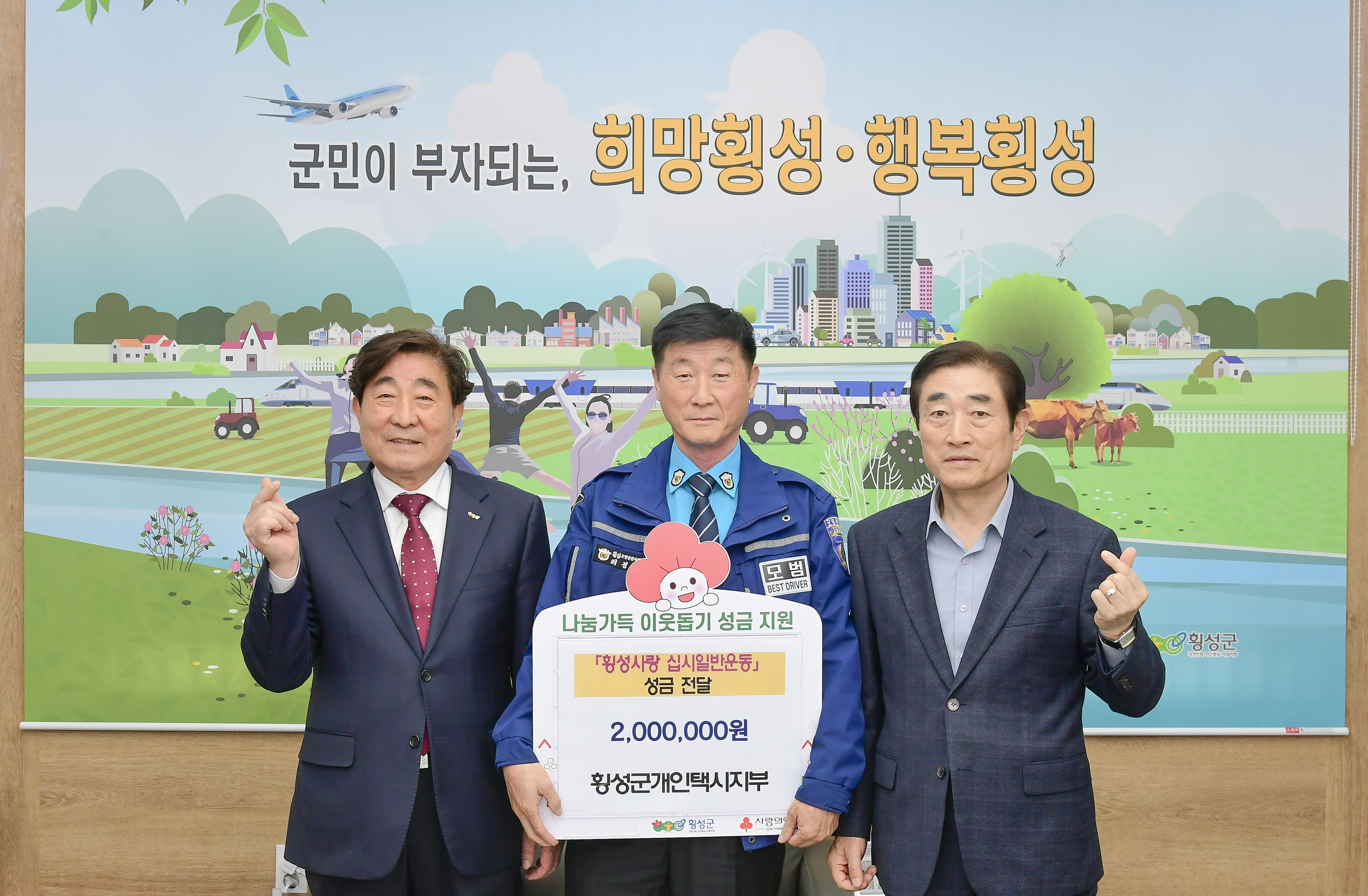 횡성군개인택시지부(지부장 허경호)는 ‘횡성사랑 십시일반운동’에 동참하는 의미에서 지난 4월 9일 14시 20분에 횡성군청을 방문하여 성금 200만 원을 전달했다.
