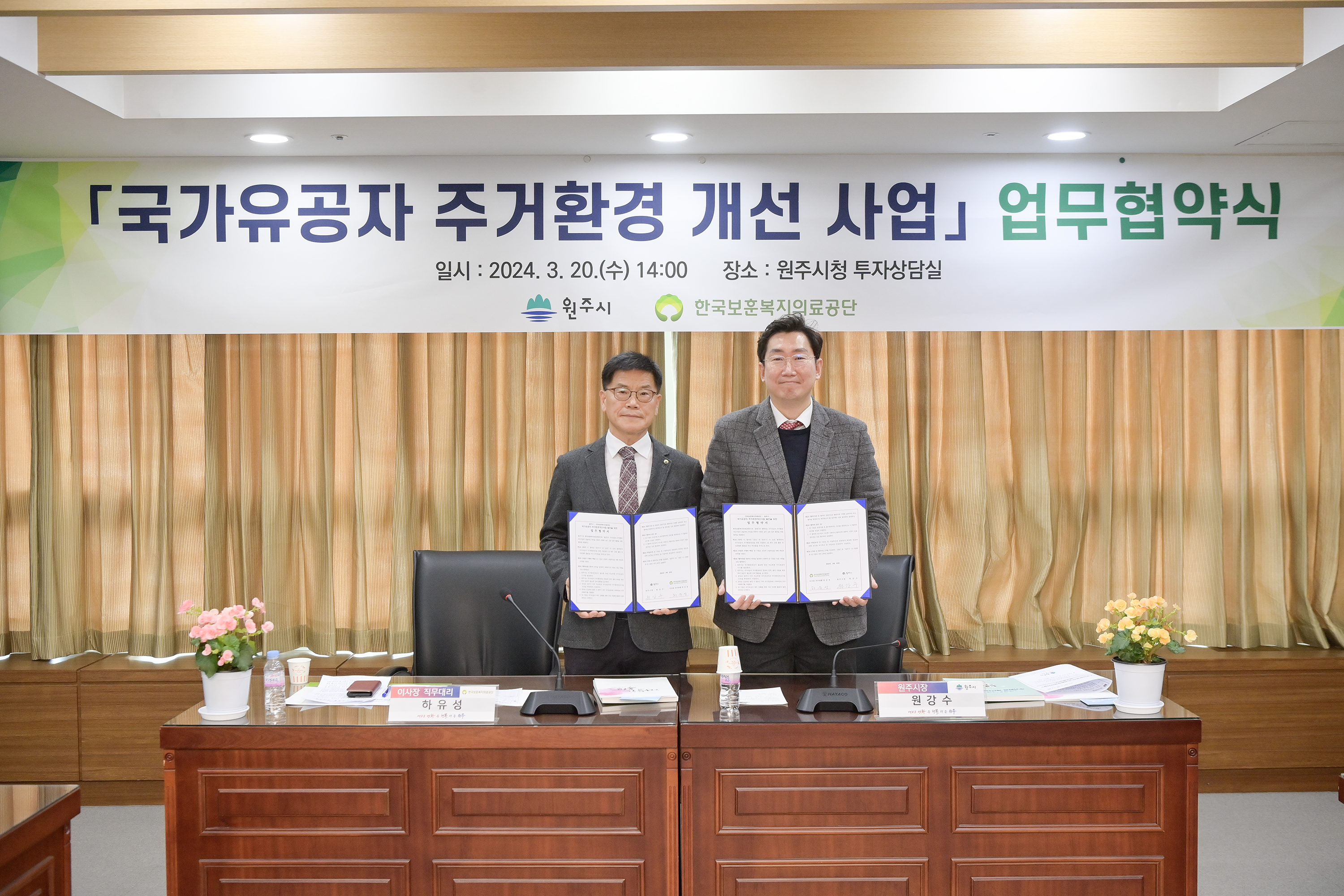 지난 3월 20일 오후 2시, 원주시청 7층 투자상담실 원주시는 지난 3월 20일 시청 7층 투자상담실에서 한국보훈복지의료공단과 저소득층 국가유공자의 주택구조나 생활편의시설을 편리하고 안전하게 개선하기 위한 ‘국가유공자 주거환경 개선 사업’ 업무협약을 체결했다. ‘국가유공자 주거환경 개선 사업’은 장애·고령 국...
