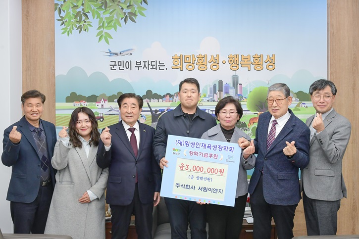 (주)서원이엔지(대표 김미아)는 횡성의 미래 인재 육성에 이바지하기 위해 지난 3월 19일에 횡성군청을 방문하여 횡성인재육성장학회에 300만 원을 전달했다.