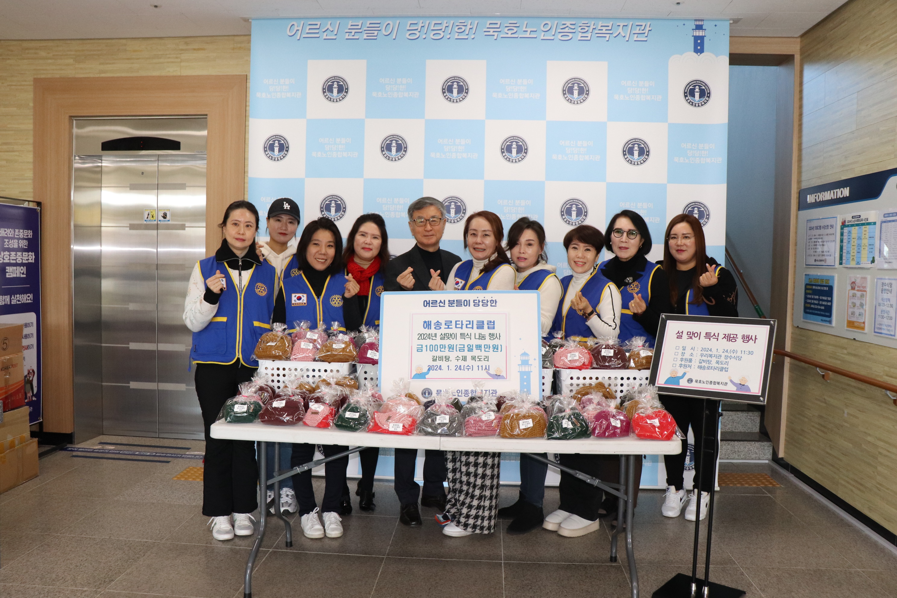 묵호노인종합복지관(관장 염규성)은 국제로타리3730지구 8지역 동해해송로타리클럽(회장 김소윤)에서 2024년 설을 맞아 복지관을 이용하시는 어르신 분들을 위해 갈비탕 특식 제공과 수제 목도리를 전달했다고 밝혔다. 이번 특식 제공 행사는 복지관을 이용하시는 어르신 200여분께 갈비탕과 20명의 회원들이 정성을 다해 손...