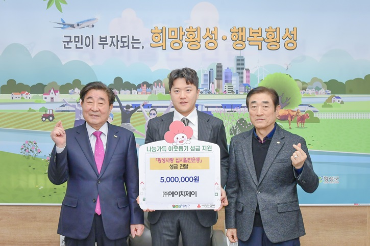 주식회사 에이치제이(대표 박정훈)는 '횡성사랑 십시일반운동'에 동참하는 의미에서 지난 3월 5일 14시 40분에 횡성군청을 방문하여 성금 500만 원을 기부했다.