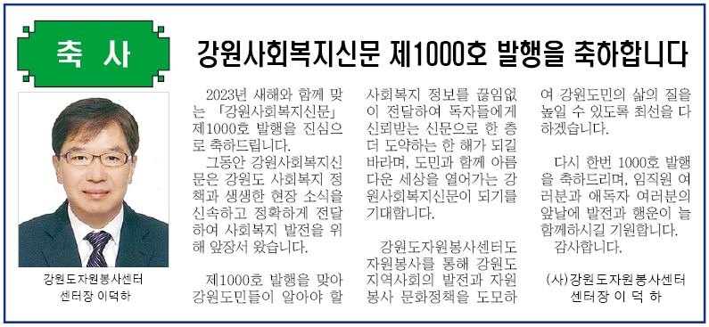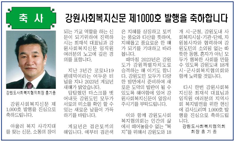 2023년 계묘년 새해를 맞이하여 강원사회복지신문 대표 최재석 2023년 계묘년 새해가 밝았습니다. 새해에도 모든 구독자 여러분들 가정에 건강과 행복이 늘 함께 하시길 기원합니다. 강원사회복지신문 대표에 취임한지 1년이 지났습니다. 그동안 저는 2022년 취임사에서 말했듯이 복지 사각지대을 찾는 신문! 소통의 장이 되...