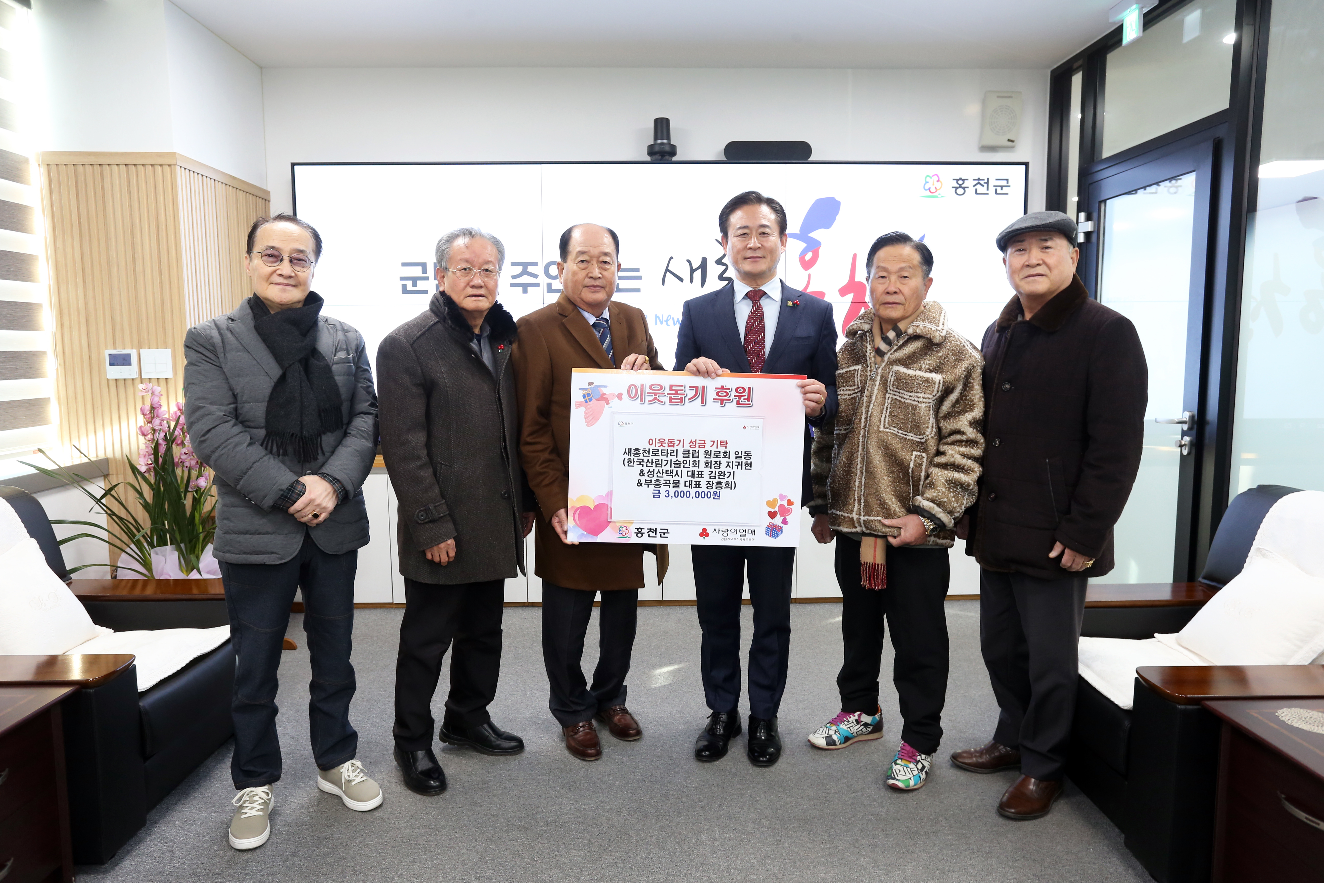 새홍천로타리클럽 원로회 일동(한국산림기술인회 회장 지귀현, 성산택시 대표 김완기, 부흥곡물 대표 장흥희)은 1월 10일 홍천군청을 방문하여 성금 300만 원을 기탁했다. 새홍천로타리클럽 원로회는 올해로 창립 42주년을 맞이하는, 국제봉사 단체 새홍천로타리클럽(회장 지연홍)의 11명의 역대회원들로 구성된 원로회원들의...