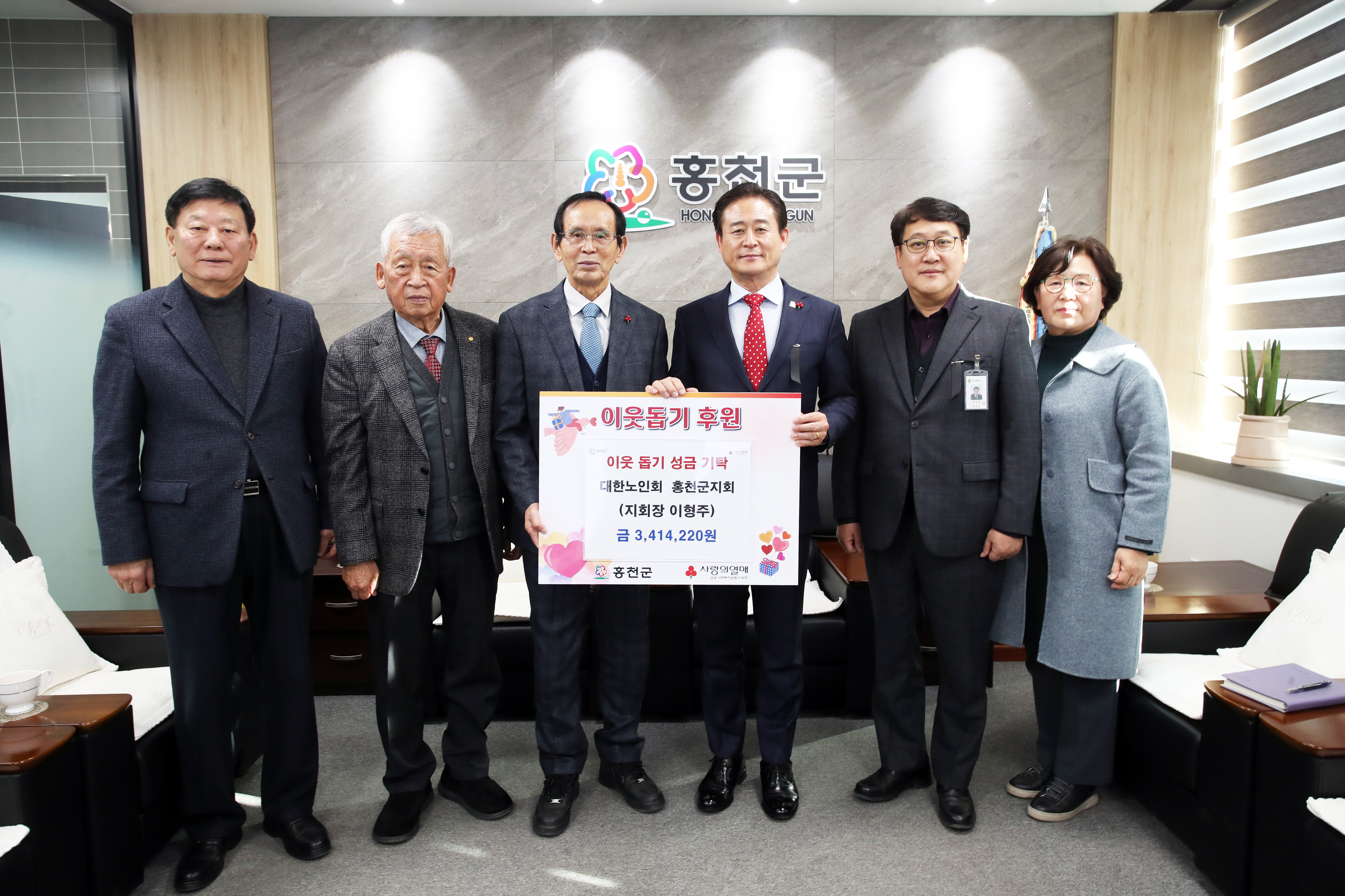 대한노인회 홍천군지회(지회장 이형주)는 1월 2일 홍천군청을 방문하여, 어려운 이웃돕기 성금 3,414,220원을 기탁했다. 이형주 지회장은 “2025년 새해를 맞아 홍천군의 어려운 이웃분들이 행복한 새해를 맞이하기를 바라는 마음에 성금을 기탁하게 되었다”라며, “성금이 도움이 필요한 곳에 잘 전달되기를 바란다”라고 ...