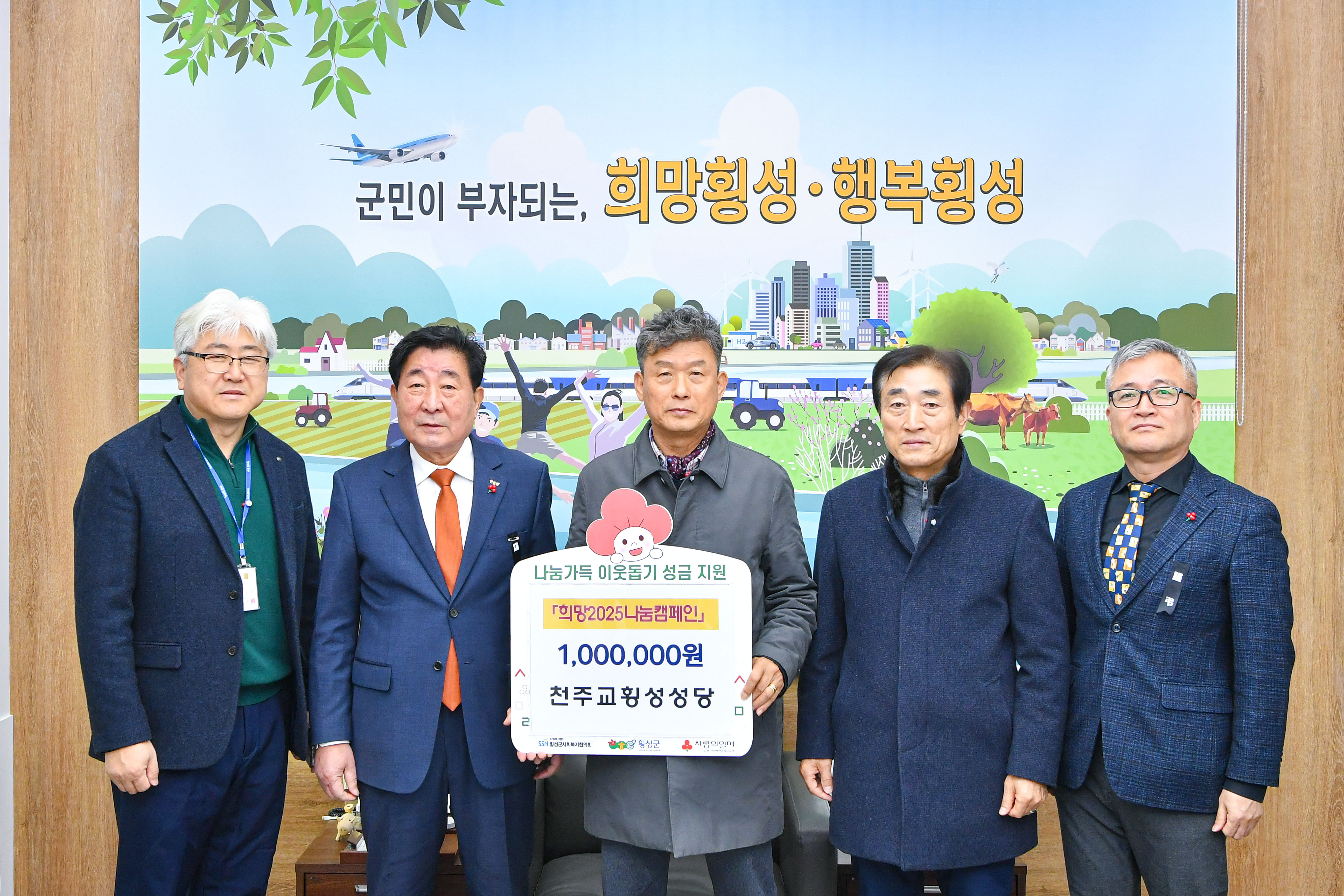 천주교 횡성성당(이희선 요한세례자 신부)은 12월 31일 9시 10분 횡성군청을 방문해 ‘희망2025나눔캠페인’ 성금 100만 원을 전달했다.