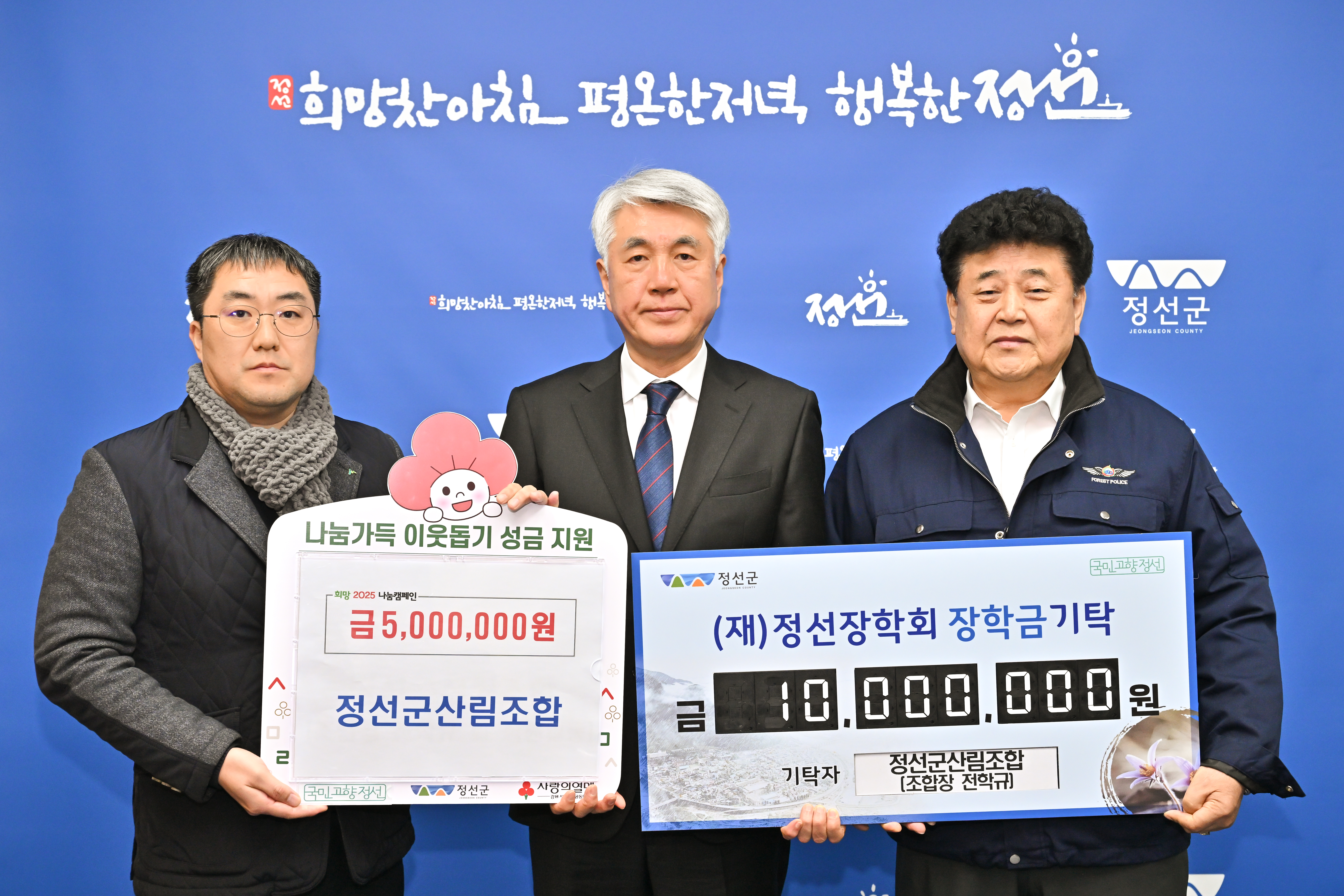 정선군산림조합(조합장 전학규)는 지난 12월 30일 (재)정선장학회에 장학금 1,000만원 및 희망 2025나눔캠페인 성금으로 500만원을 기탁했다.