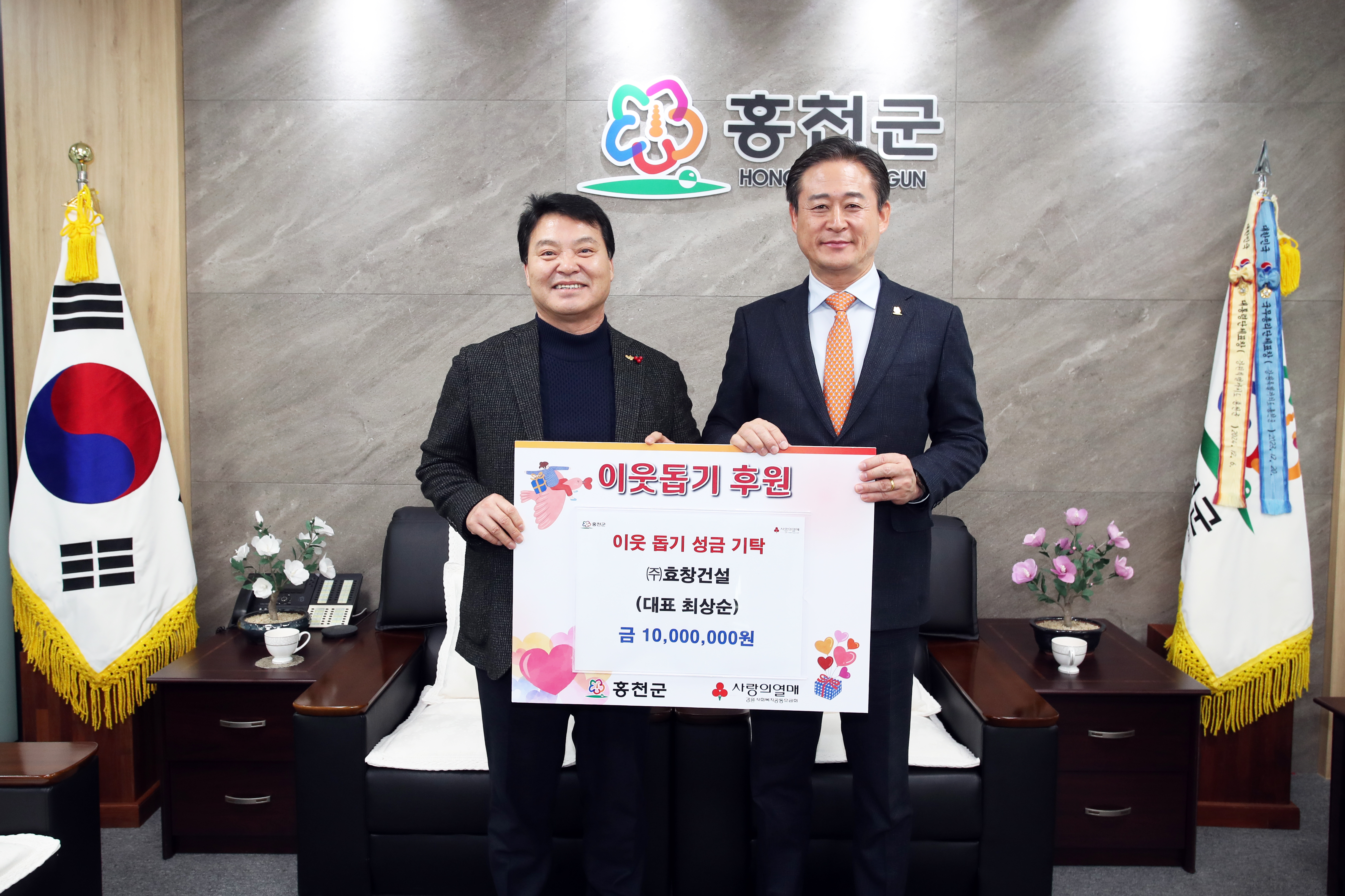 (주)효창건설(대표 최상순)은 12월 27일 홍천군청을 방문하여, 어려운 이웃돕기 성금 1,000만원을 기탁했다. 최상순 대표는 “홍천군의 어려운 이웃분들이 따스한 연말을 보내길 바라는 마음에 성금을 기탁하게 되었다”라며, “성금이 도움이 필요한 곳에 잘 전달되어 연말을 잘 보내시길 바란다”라고 말했다. 신영재 홍천...