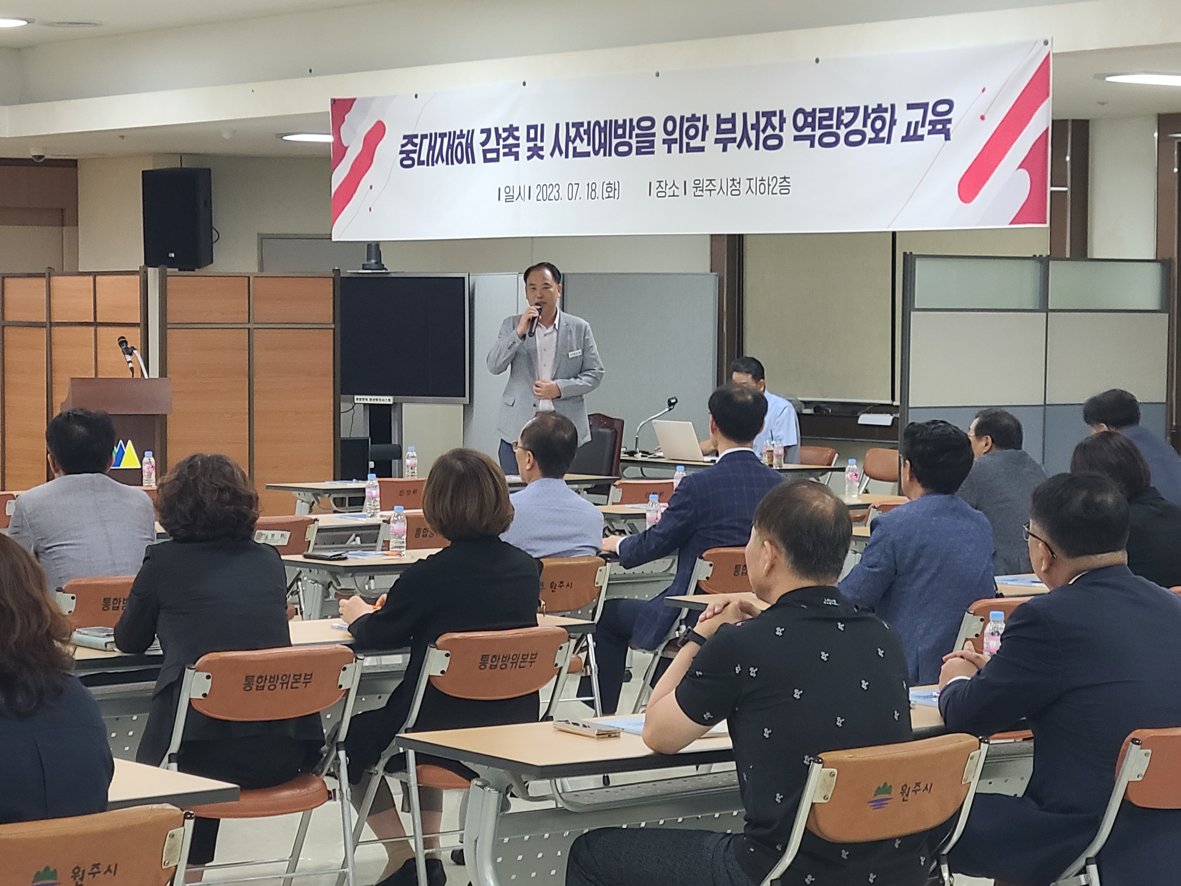 [강원사회복지신문 서은진 기자]=원주시는 지난 7월 18일 '중대재해 감축 및 사전예방을 위한 역량강화 교육'을 실시하였다. 이번 교육은 실질적으로 근로자를 지휘·감독하는 부서장 105명을 대상으로, 국정과제 최우선 전략인 '위험성평가를 핵심 수단으로 사전 예방체계 확립'이라는 주제로 관리자의 효과적인 업무 수행 ...