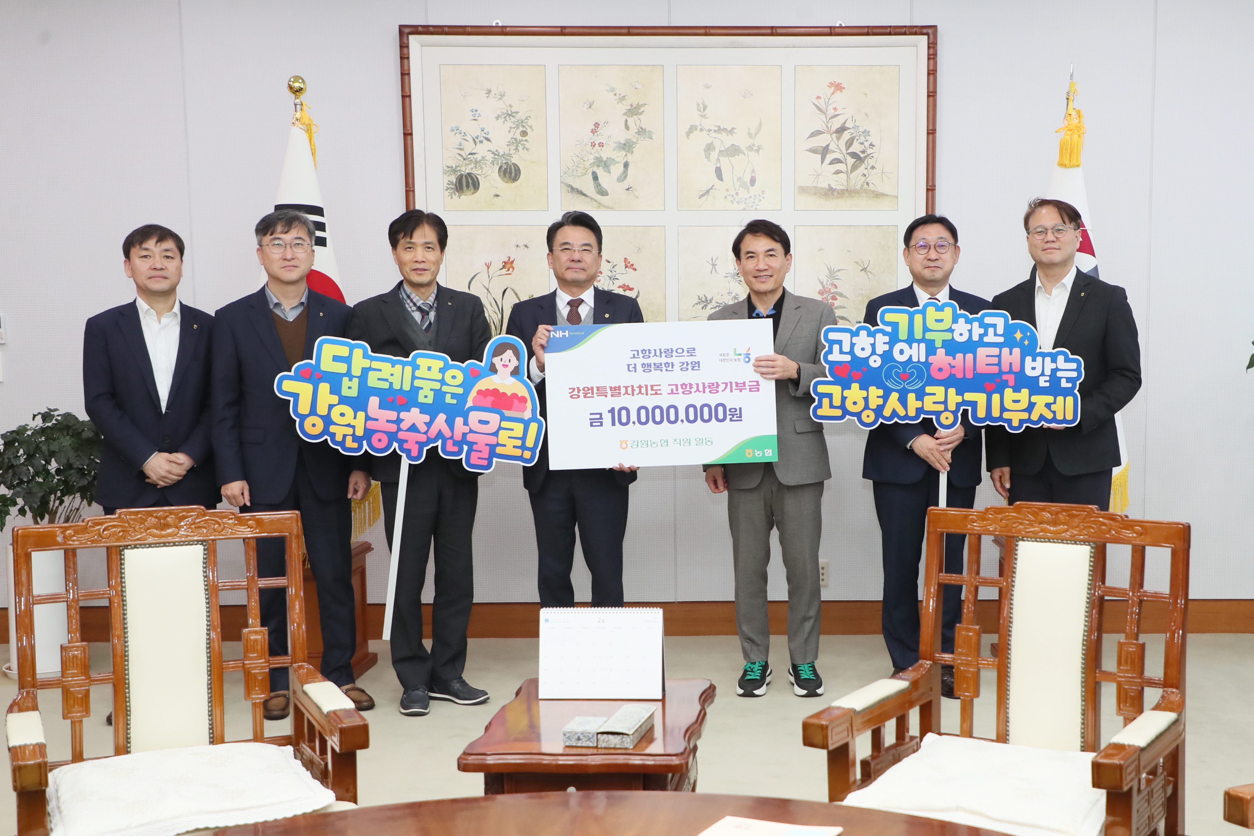 직원들의 따뜻한 마음을 모아 기부 농협중앙회 강원본부(본부장 김경록)가 2월 27일 강원특별자치도청을 방문해 김진태 강원특별자치도지사에게 고향사랑기부금을 전달했다. 이번 기부는 농협 직원들이 자발적으로 기부금을 모아 더욱 의미가 크다. 이날 기탁식에는 김경록 농협중앙회 강원본부장과 김기연 NH농협은행 강원본...