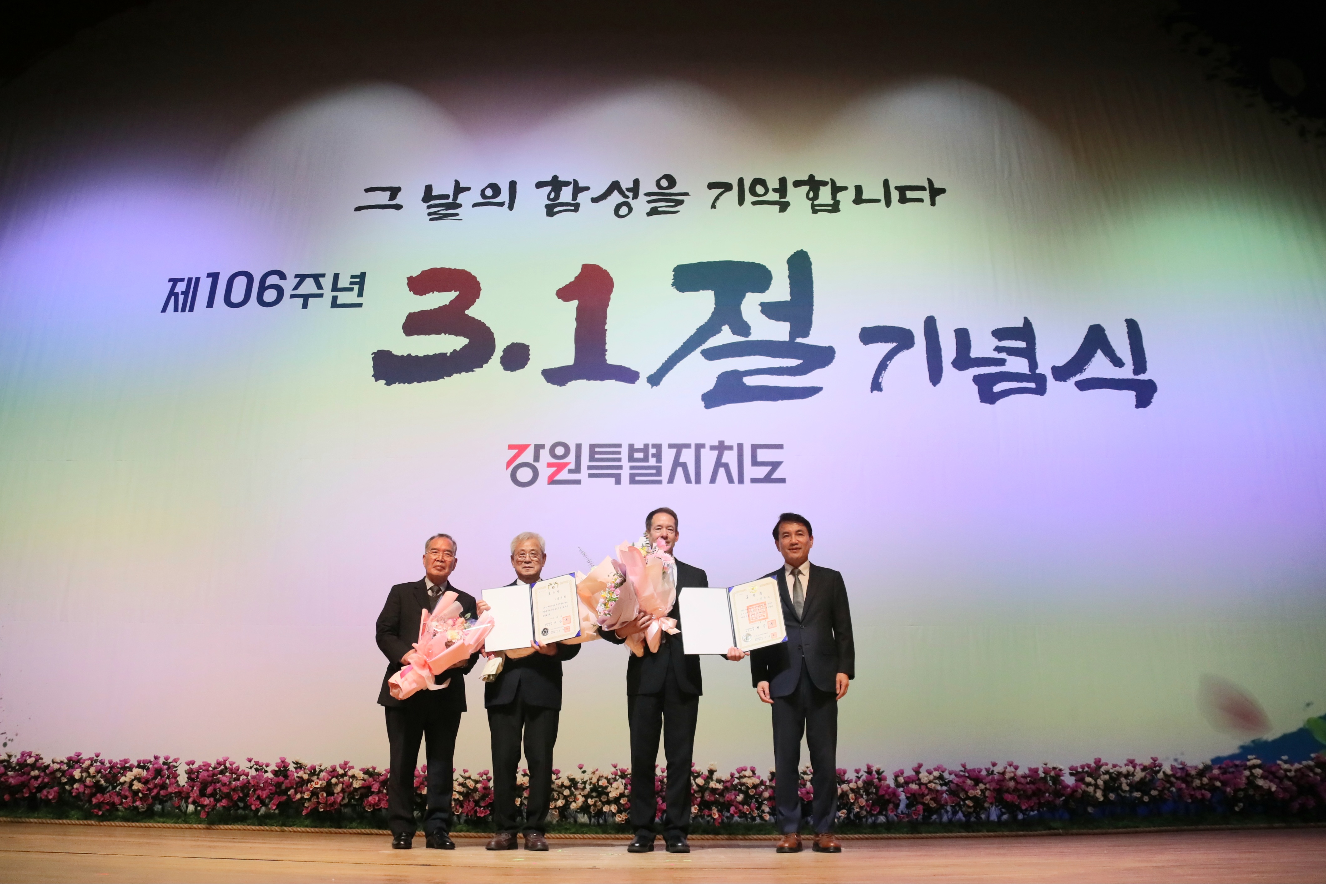 산업지도 재편으로 진정한 경제적 독립 이룰 것 3월 1일(토) 10시, 강원대학교(백령아트센터), 1,000여 명 참석 강원특별자치도(도지사 김진태, 이하 ‘도’)가 3월 1일 오전 10시, 강원대학교 백령아트센터에서 ‘제106주년 3.1절 기념식’을 개최했다고 밝혔다. 기념식에는 김진태 도지사, 김시성 도의회 의장, 김문덕 광복...