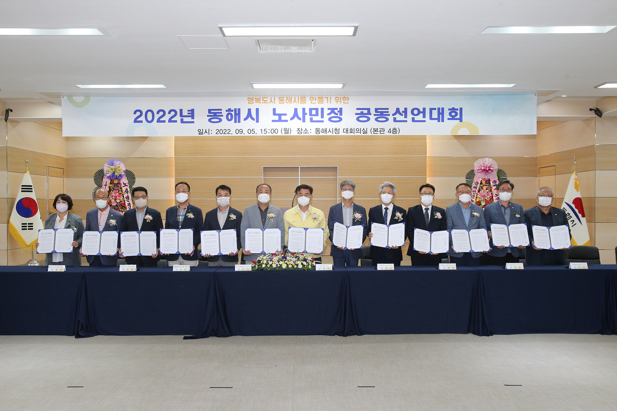 [강원사회복지신문 김종한 기자]=상생과 협력의 일자리확산과 지역경제 회복을 위한 지역경제활성화 다짐 동해시(시장 심규언)는 지난 9월 5일 2022년 제1회 노사민정협의회를 개최하고, 노사민정 공동선언 대회를 개최했다고 밝혔다. 이날 공동선언에는 동해시, 동해시의회, 노동계, 경영계, 시민단체 대표 등이 참석, 상생...