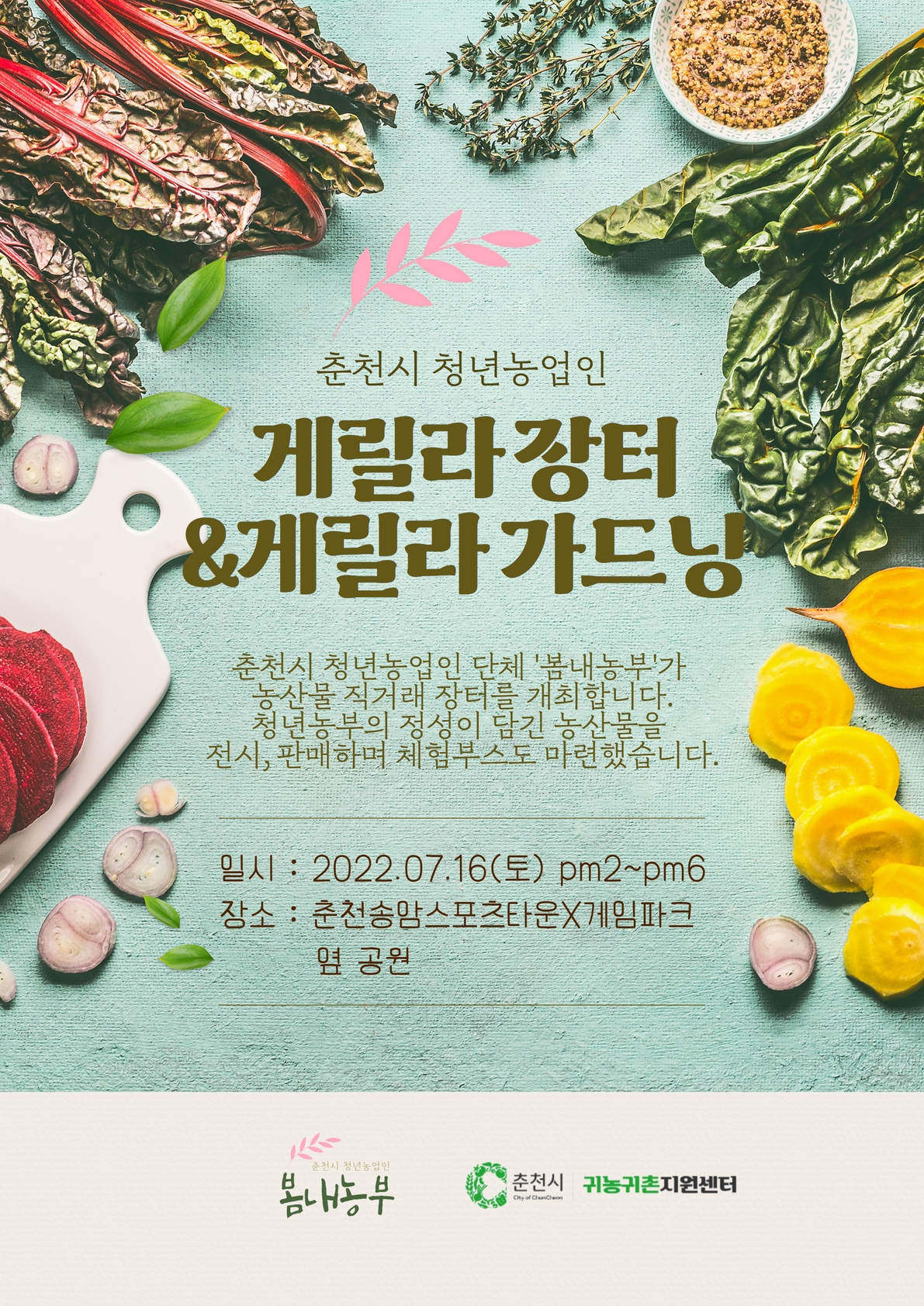 [강원사회복지신문 이정환 기자]=청년농업인 '게릴라 장터&가드닝' 농산물 직거래 장터 16일 개최 청년농업인 영농정착지원사업 지원대상자 13인이 생산한 농산물 판매 춘천시에 따르면 청년농업인 '게릴라 장터&가드닝' 농산물 직거래 장터가 오는 7월 16일 오후 2시부터 5시까지 송암스포츠타운 내 물레길 카누체험...