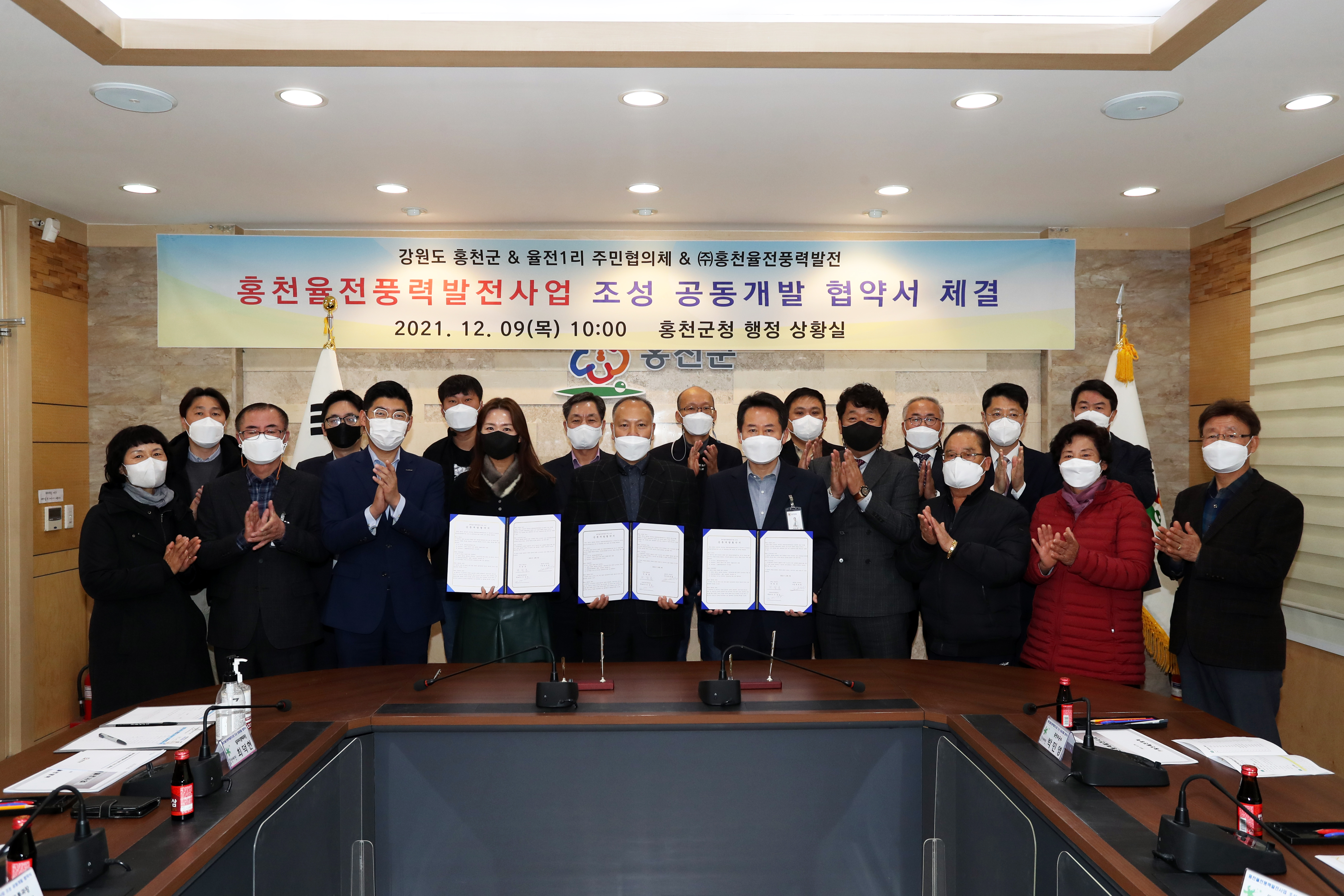 [강원사회복지신문 홍기한 기자]=내면 율전리 산188-2번지 일원 풍력발전단지 조성 총 사업비 약 1,800억원 규모, 발전량 60.5MW(5.5MW × 11기) 홍천군에 탄소배출 없이 청정에너지를 공급하는 주민참여형 풍력발전단지가 들어선다. 홍천군과 율전1리·(주)홍천율전풍력발전(대표이사 구영임)은 지난 12월 9일 '홍천 율전풍...