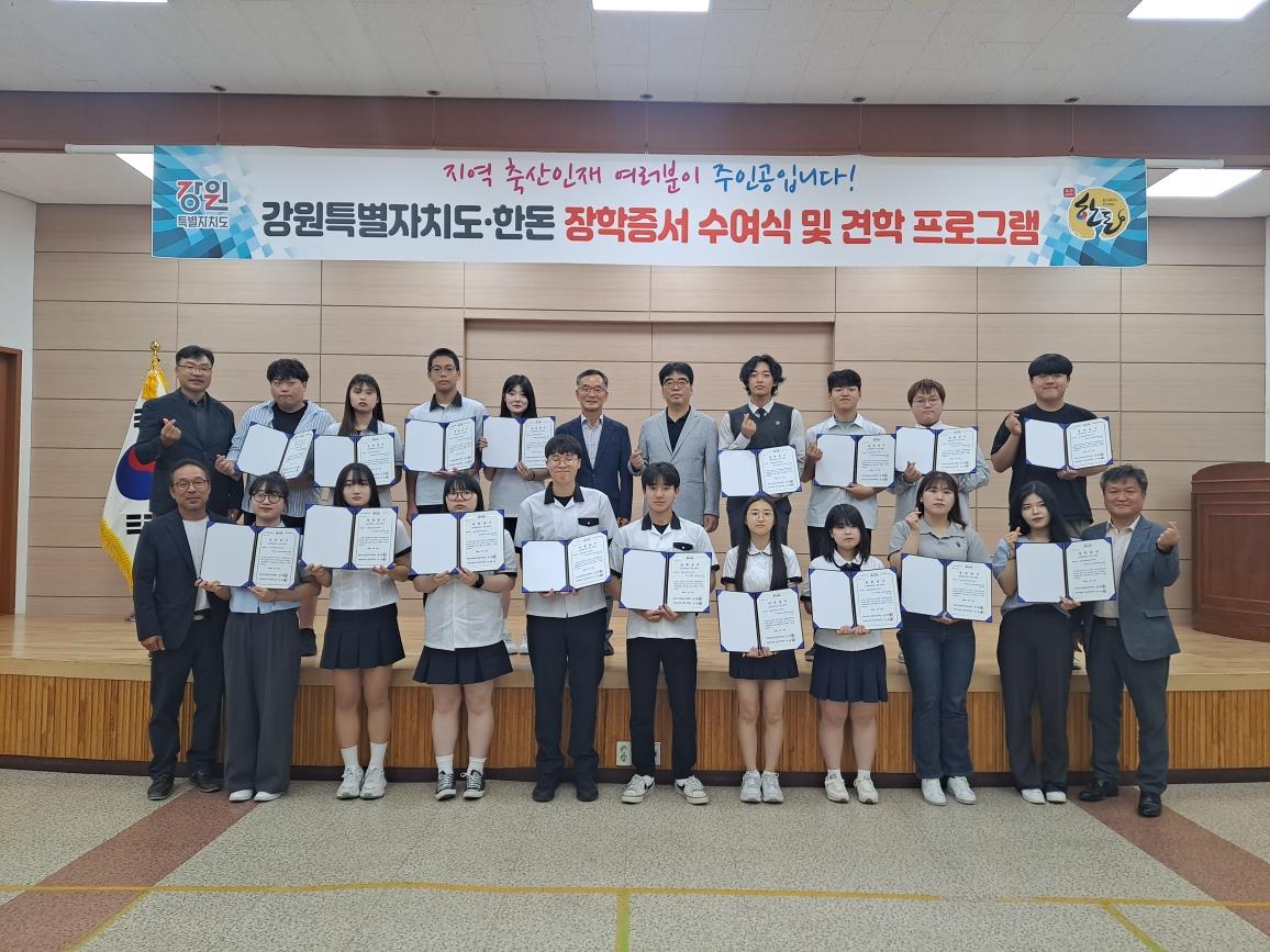 강원인재육성평생교육진흥원(이하 인평원)은 지난 6월 20일 국립축산과학원 강원연구소에서 대한한돈협회 강원도협의회와 함께 장학증서 수여식을 개최하고 장학생 26명에게 총 2,000만 원의 장학금을 지급했다.