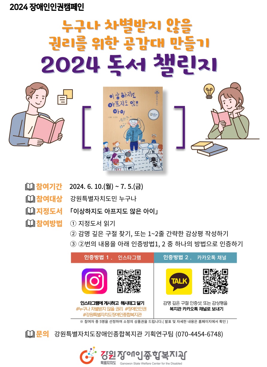 강원특별자치도장애인종합복지관(관장:엄정호)은 도내 지역주민의 장애인인권에 대한 인식을 개선하고, 인권감수성을 향상할 수 있도록 2024 장애인인권캠페인 ‘독서 챌린지’를 진행한다. ‘누구나 차별받지 않을 권리를 위한 공감대 만들기’를 주제로 진행되는 이번 독서 챌린지를 통해 인권관련 도서를 지역주민과 함께...