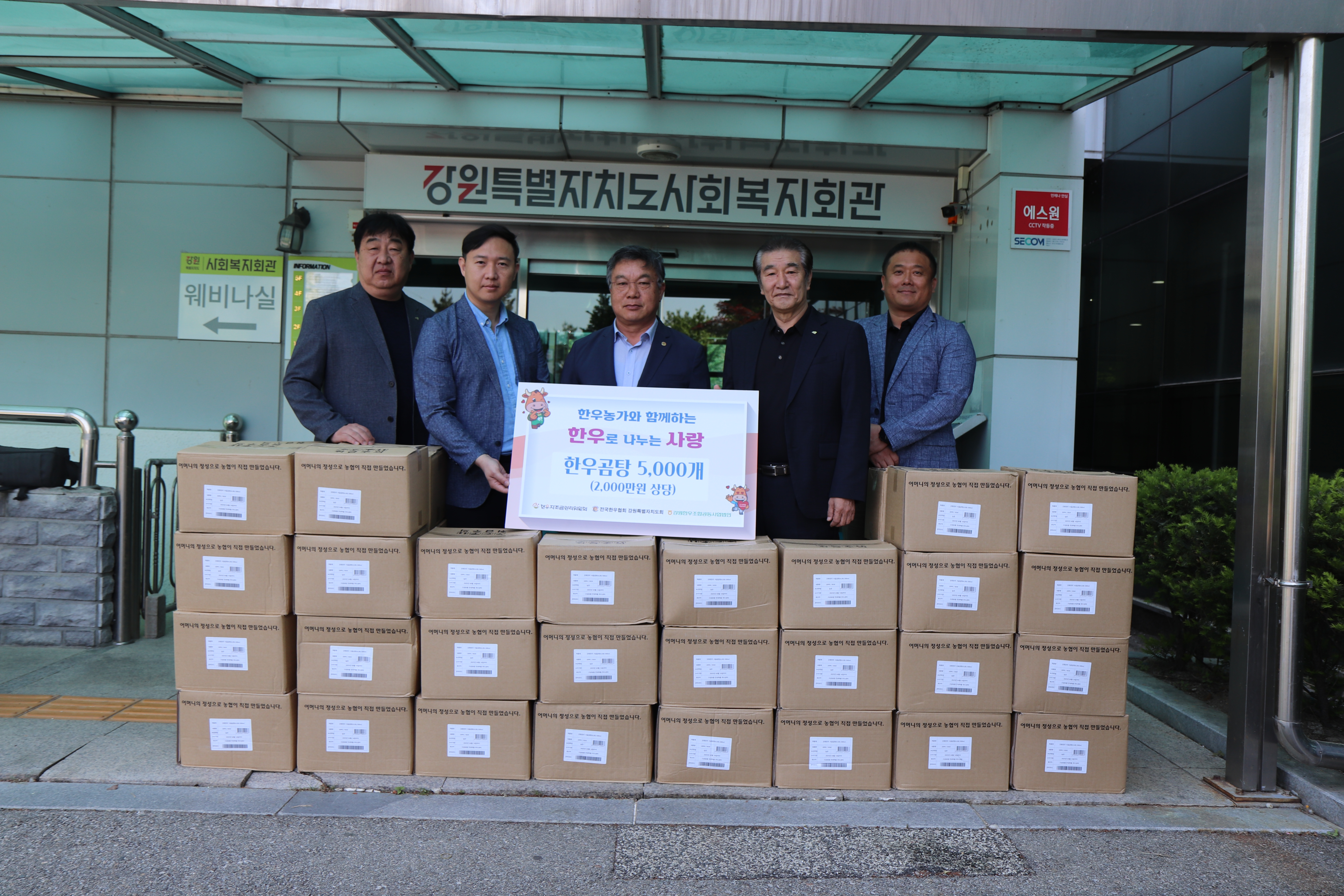 전국한우협회강원특별자치도지회(지회장 박영철)는 지난 5월 2일 오전 11시 강원특별자치도사회복지회관에서 한우곰탕(5,000개 / 2,000만원 상당)을 강원특별자치도사회공헌정보센터(센터장 홍기종)을 통해 기탁했다. 전국한우협회강원도지회에서 기탁한 한우곰탕(5,000개 / 2,000만원 상당)은 5월 가정의 달을 맞이하여 도사...