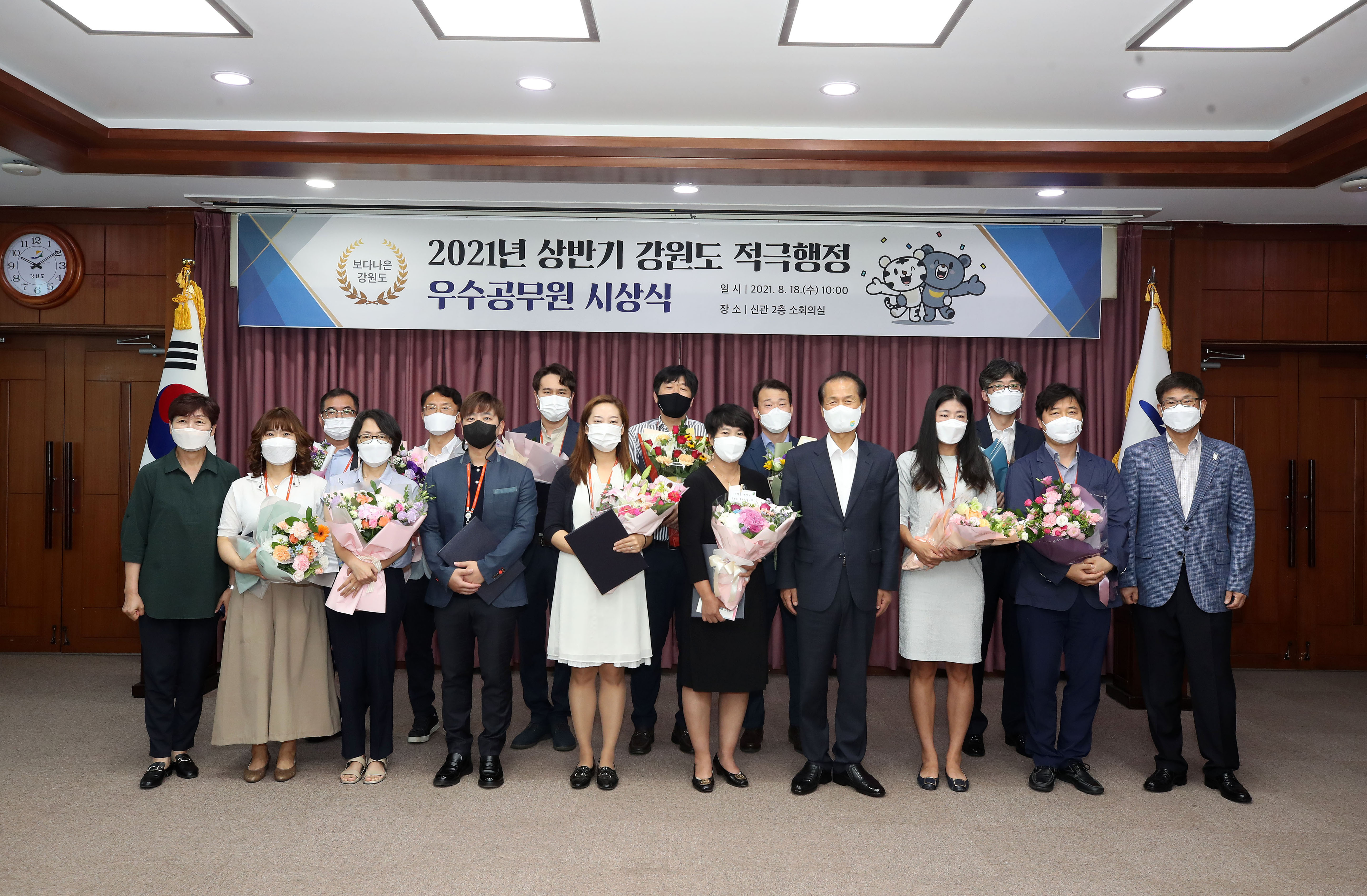 [강원사회복지신문 서은진 기자]=강원도(도지사 최문순)는 적극행정으로 모범적인 성과를 창출한 우수공무원에 대하여 지난 8월 18일(수) 오전 10시, 강원도청 신관 소회의실에서 '2021년 상반기 적극행정 우수공무원 시상식'을 개최했다. 이번에 수상한 우수공무원은 1차 내·외부 심사단 평가와 전 직원 투표를 거쳐 2차 강...
