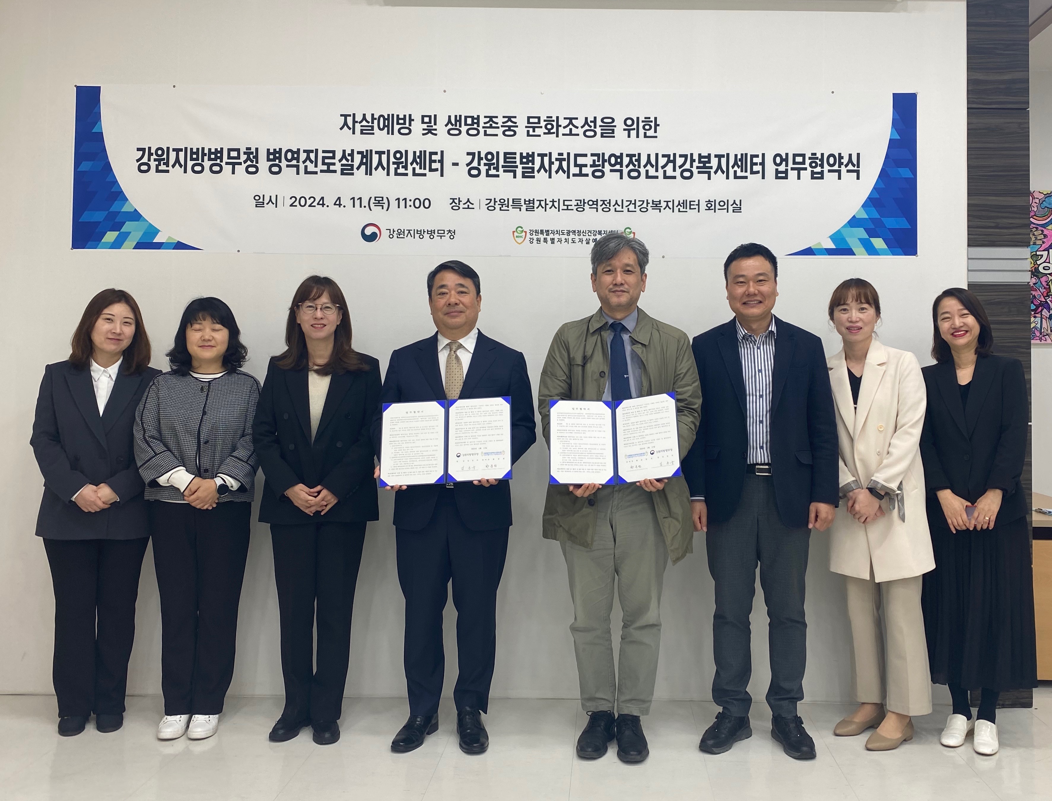 강원특별자치도광역정신건강복지센터 부설 강원특별자치도자살예방센터(센터장:황준원)는 지난 4월 11일(목) 오전 11시 청년기 자살고위험 병역의무자의 자살예방 및 정신건강증진을 위해 강원지방병무청 병역진로설계지원센터(병무청장 :김동욱)와 업무협약(MOU)을 체결하였다. 업무협약 내용으로는 도내 병역이행 전반에 대...