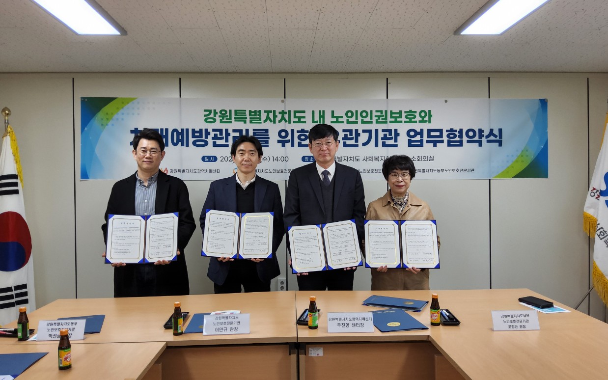 강원특별자치도노인보호전문기관(관장:이만규), 강원특별자치도남부노인보호전문기관(관장:최정인), 강원특별자치도동부노인보호전문기관(관장:박선균)이 지난 3월 21일 노인인권보호 및 노인학대예방 실천을 통한 건강한 가정과 사회를 조성하고자 강원특별자치도광역치매센터와 업무협약식을 가졌다. 이날 강원특별자치도 ...