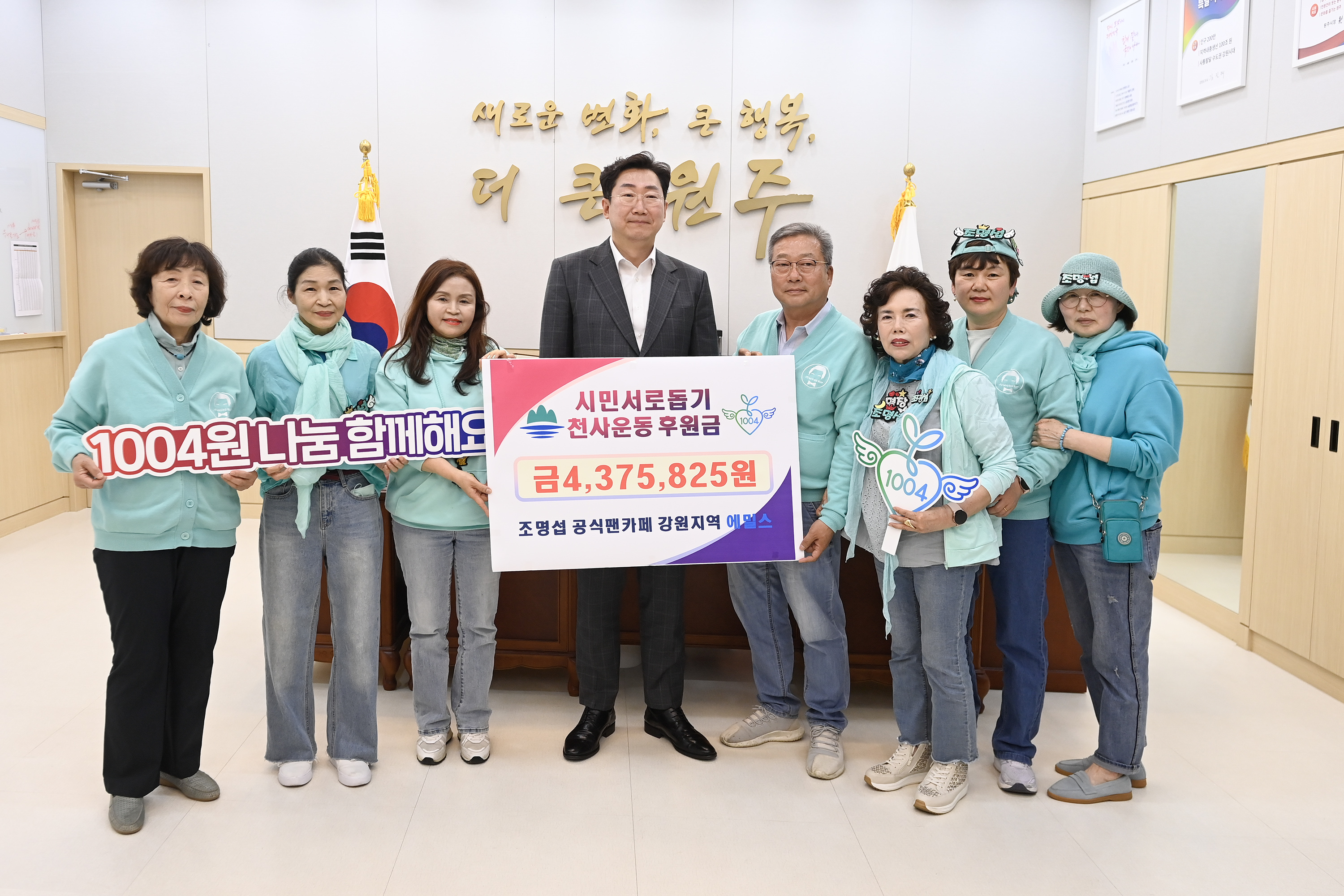 [강원사회복지신문 김도연 기자]=조명섭 공식 팬카페 강원지역 '에밀스'(강원지역장 이은성)는 지난 5월 4일 시장 집무실에서 천사운동 후원금 437만 5,825원을 기탁했다. 이날 전달식에는 이은성 강원지역장을 비롯해 엄선희·백미애·윤정녀·김호철·이미옥·이지화 회원, 천사운동 관계자 등이 참석했다. 이은성 강원지역...
