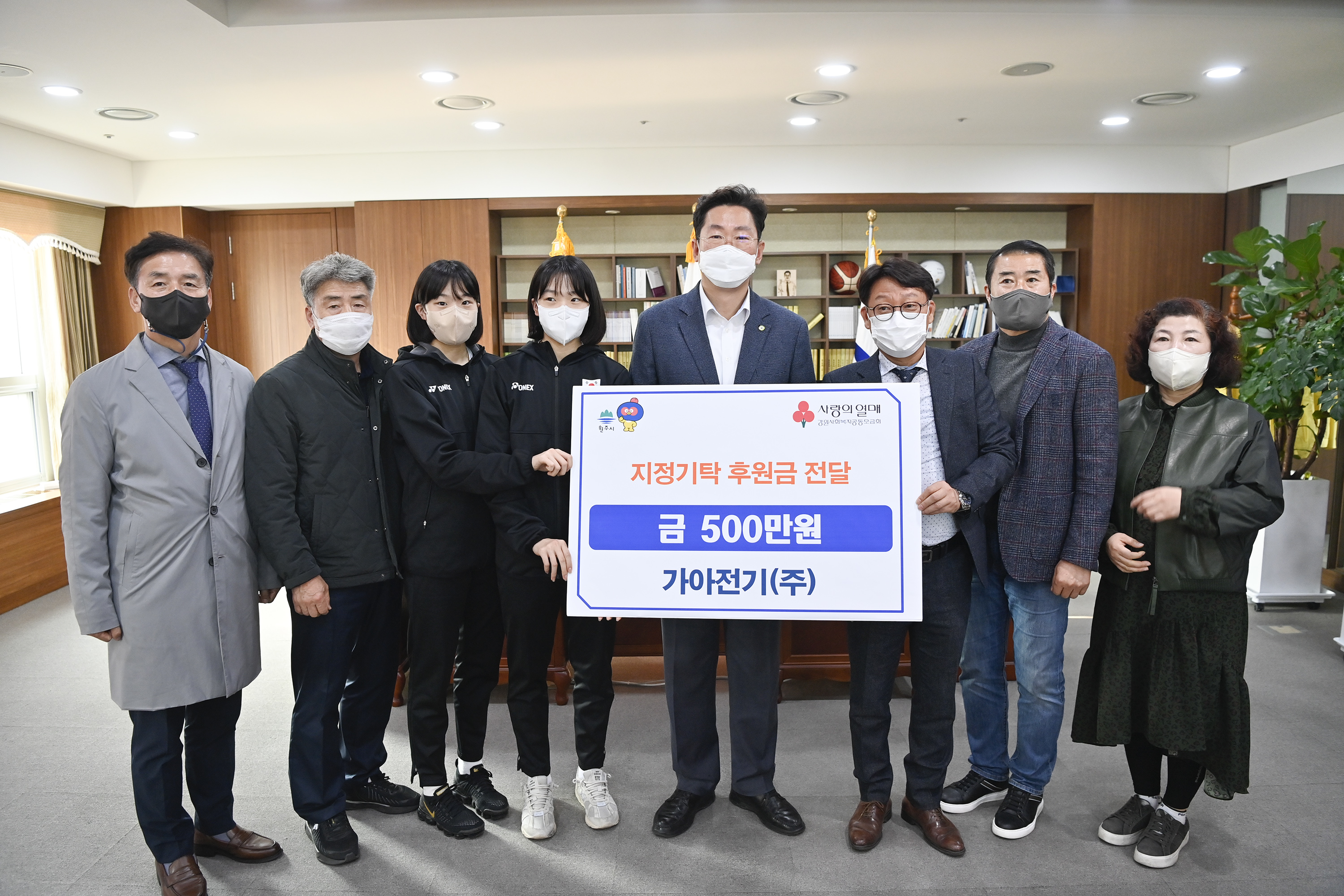 [강원사회복지신문 이정환 기자]=가아전기(주)(상무이사 최민식)는 지난 11월 10일 배드민턴 김민지, 김민서 선수에게 지정기탁금 500만 원을 전달했다. 김민지, 김민서 선수는 현재 치악고에 재학 중으로, 제103회 전국체육대회, 전국종별배드민턴선수권대회 등 각종 대회에서 금메달을 획득하는 등 우수한 성적을 거둔 장래...