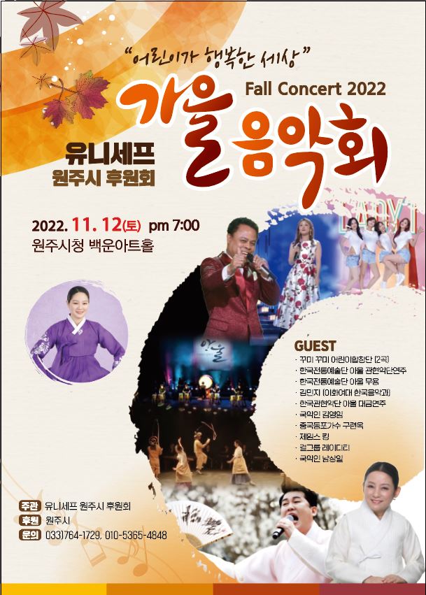 [강원사회복지신문 김도연 기자]=유니세프 원주시후원회(회장 김효종)가 주최하고 원주시에서 후원하는 '어린이가 행복한 세상' 유니세프 원주 가을 음악회가 오는 11월 12일 오후 7시 원주시청 백운아트홀에서 개최되었다. 이번 행사에서는 유니세프 기금 마련을 위해 전통과 현대가 어우러진 풍성한 음악과 다양한 공연이 ...