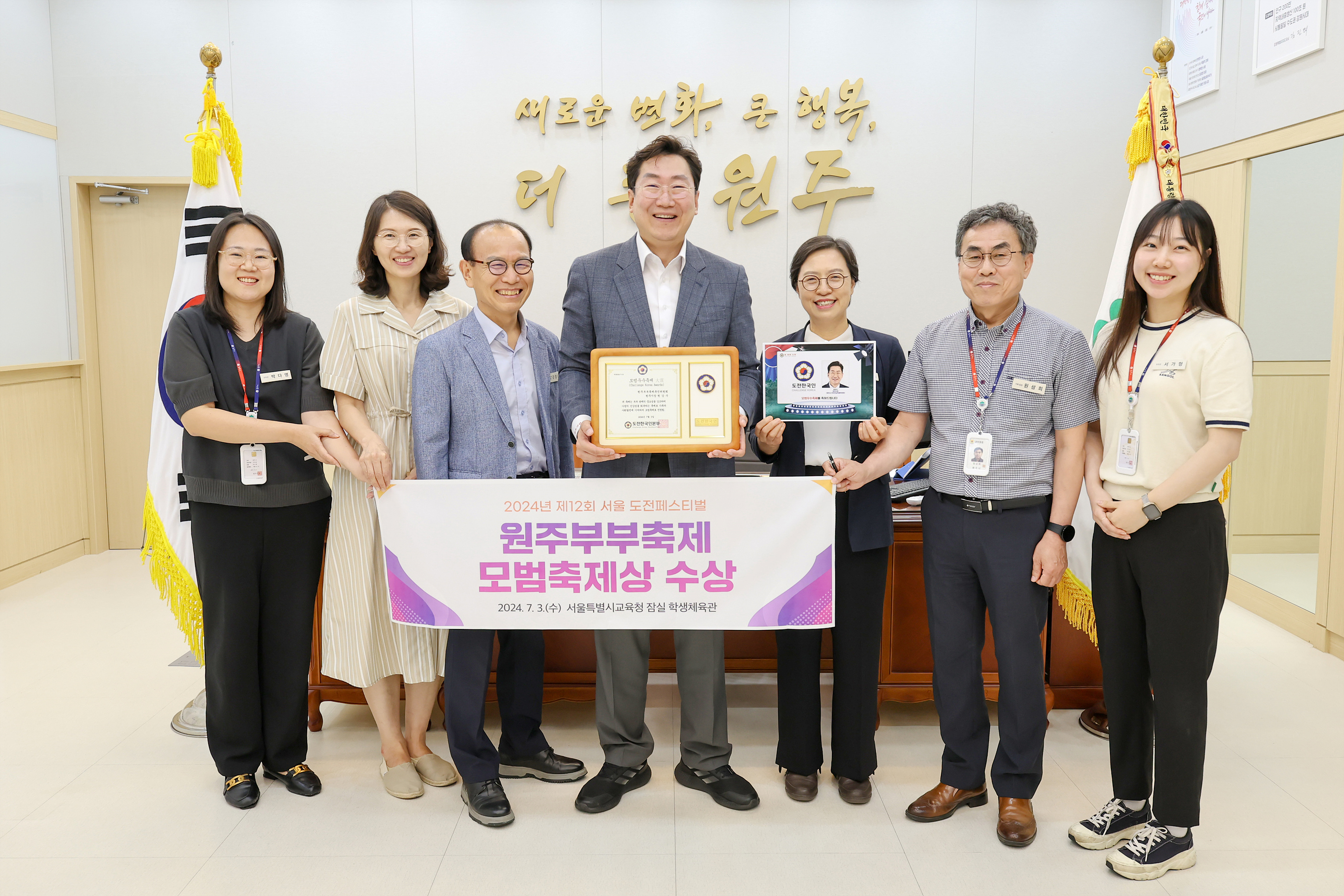 한국인운동본부, (사)도전한국인본부 주최·주관, 2024 도전페스티벌 원주시가 지난 7월 3일 서울특별시교육청 잠실학생체육관에서 개최한 ‘2024년 도전페스티벌’에서 ‘원주 부부축제’가 전국 유일 모범 우수축제로 선정되는 영예를 안았다. 올해로 12번째 열린 이번 행사는 도전한국인운동본부, (사)도전한국인본부가 주...