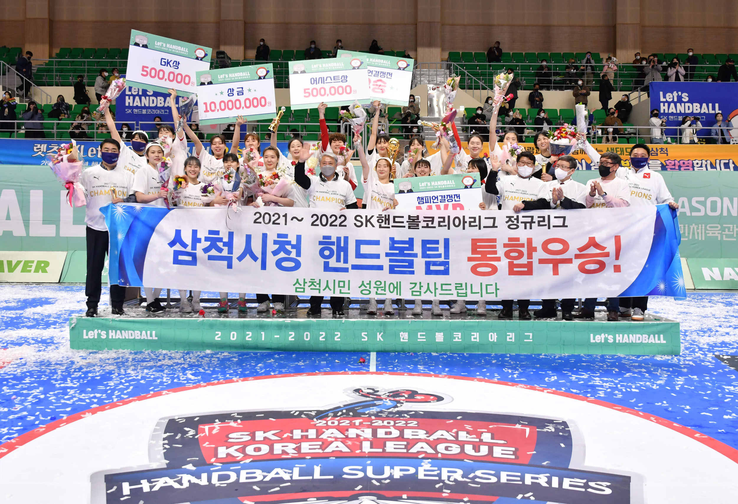 [강원사회복지신문 김종한 기자]=삼척시청 여자핸드볼팀이 2021~2022 SK핸드볼코리아리그에서 정규리그 우승, 챔피언전에 우승을 해서 통합우승을 달성했다. 이어서 4월 6일(수) 오후 4시 삼척시청 시민회의장에서 우승컵 봉납식을 가졌다. 이계청 감독이 이끄는 삼척시청 여자핸드볼팀은 1월 6일(목) 첫 경기를 시작으로 지...