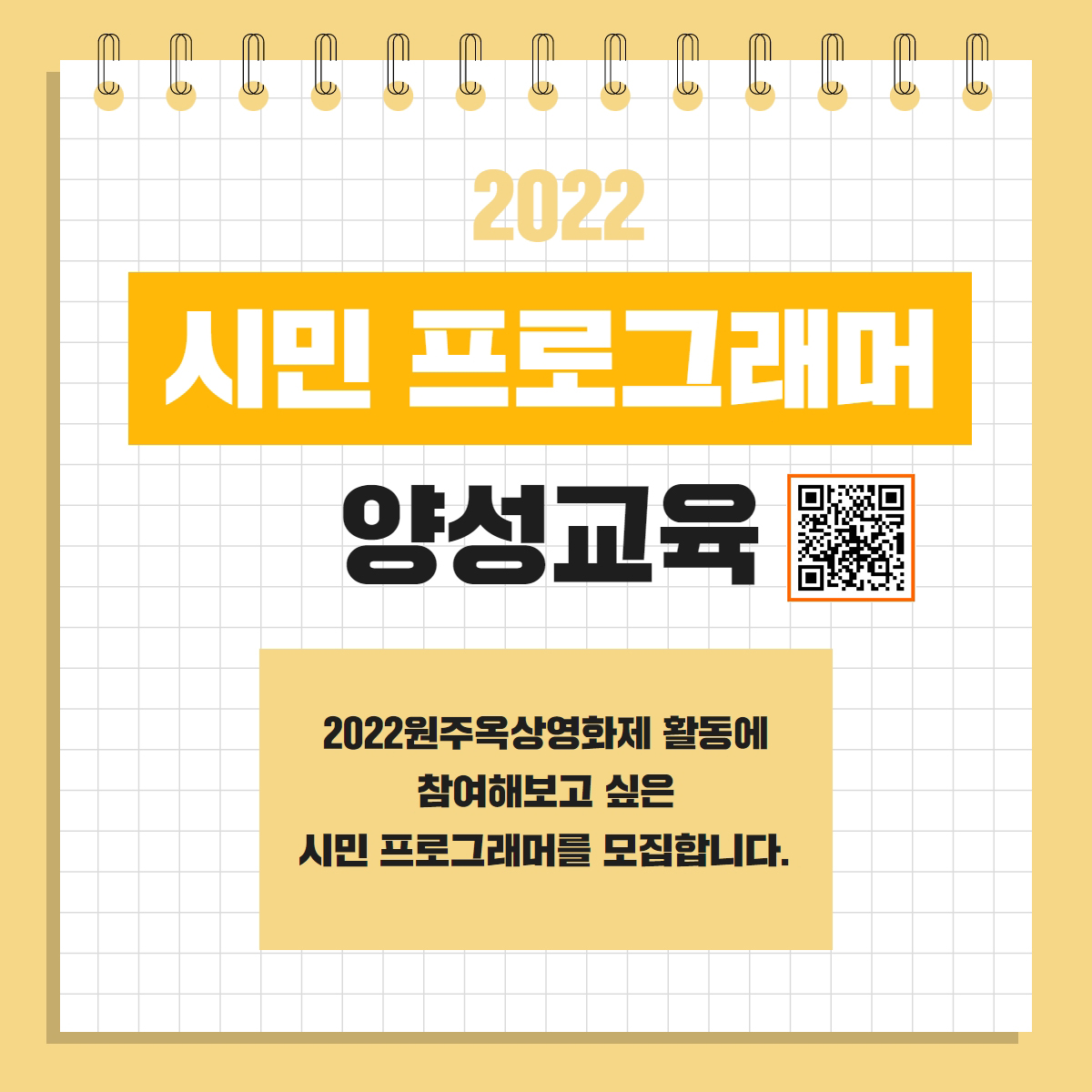 [강원사회복지신문 홍기한 기자]=4월 17일까지 온라인으로 모집 교육 수료 후 '2022 원주옥상영화제 강원단편선' 상영작 선정 2022 원주옥상영화제가 오는 4월 17일까지 '시민 프로그래머 양성과정' 수강생을 모집한다. 올해로 2회째를 맞이한 ‘시민 프로그래머 양성과정’은 도내에서 제작된 최신 단편 영화를 감상 후 교육...