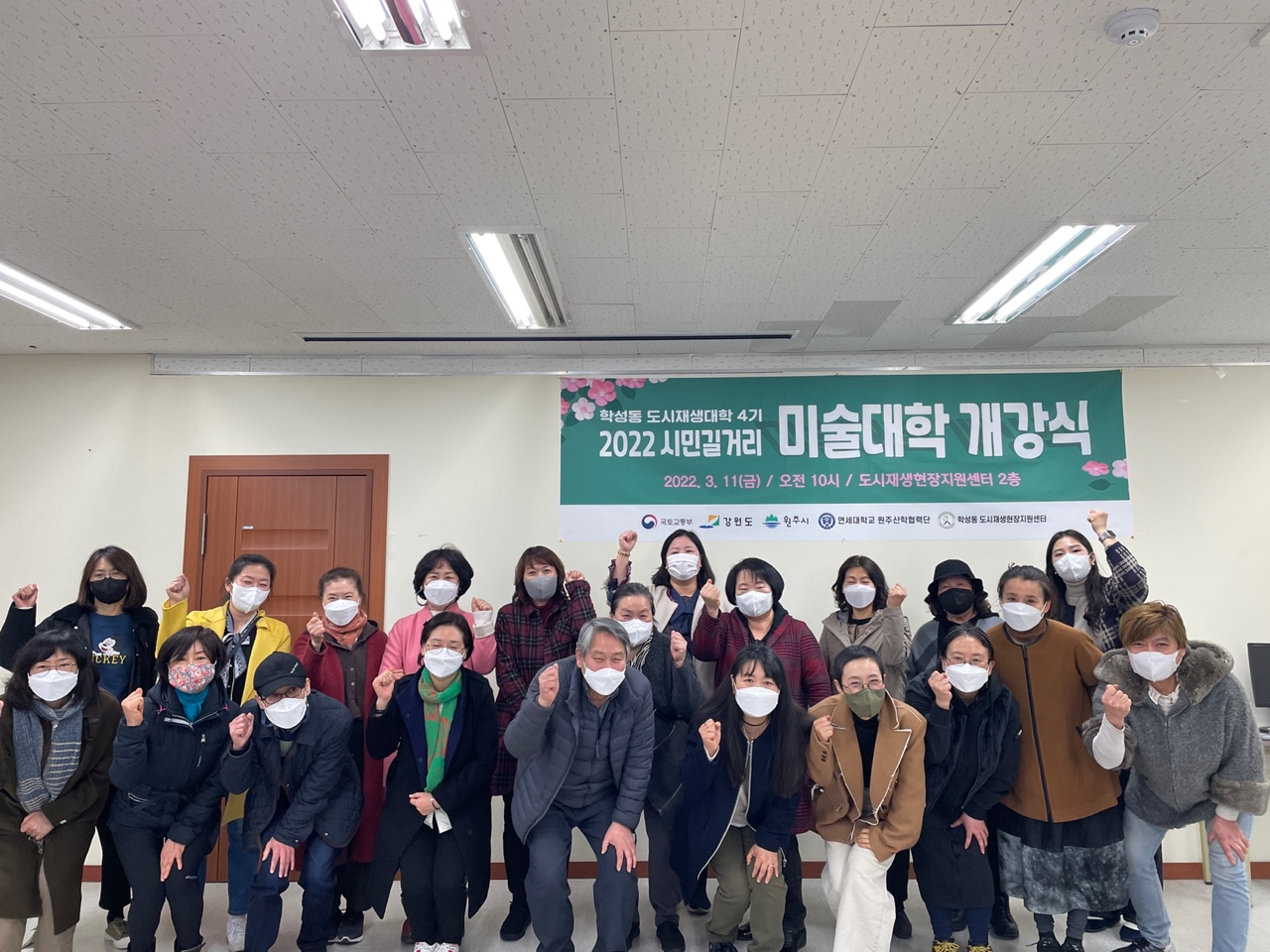 [강원사회복지신문 이정환 기자]=지난 3월 11일 오전 10시 학성동 도시재생현장지원센터에서 개최 4월 24일까지 학성동 역전시장 일원에서 문화예술프로그램 8강좌 진행 원주시는 지난 3월 11일 오전 10시 학성동 도시재생현장지원센터에서 수강생 및 시 관계자, 민족미술인협회 원주지부 등이 참석한 가운데 2022년 학성동 ...