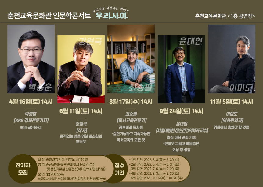 [강원사회복지신문 홍기한 기자]=춘천교육문화관(관장 강흥준)은 관내 학생, 학부모, 지역주민을 대상으로 2022년 인문학콘서트 '우리 시대 사람 사는 이야기(이하 우.리.사.이.)'를 오는 4월 16일(토)부터 운영한다. 춘천교육문화관 '우.리.사.이.'는 최신 트렌드에 맞는 다양한 주제의 명사 초청 강연으로, 춘천 관내 학생...