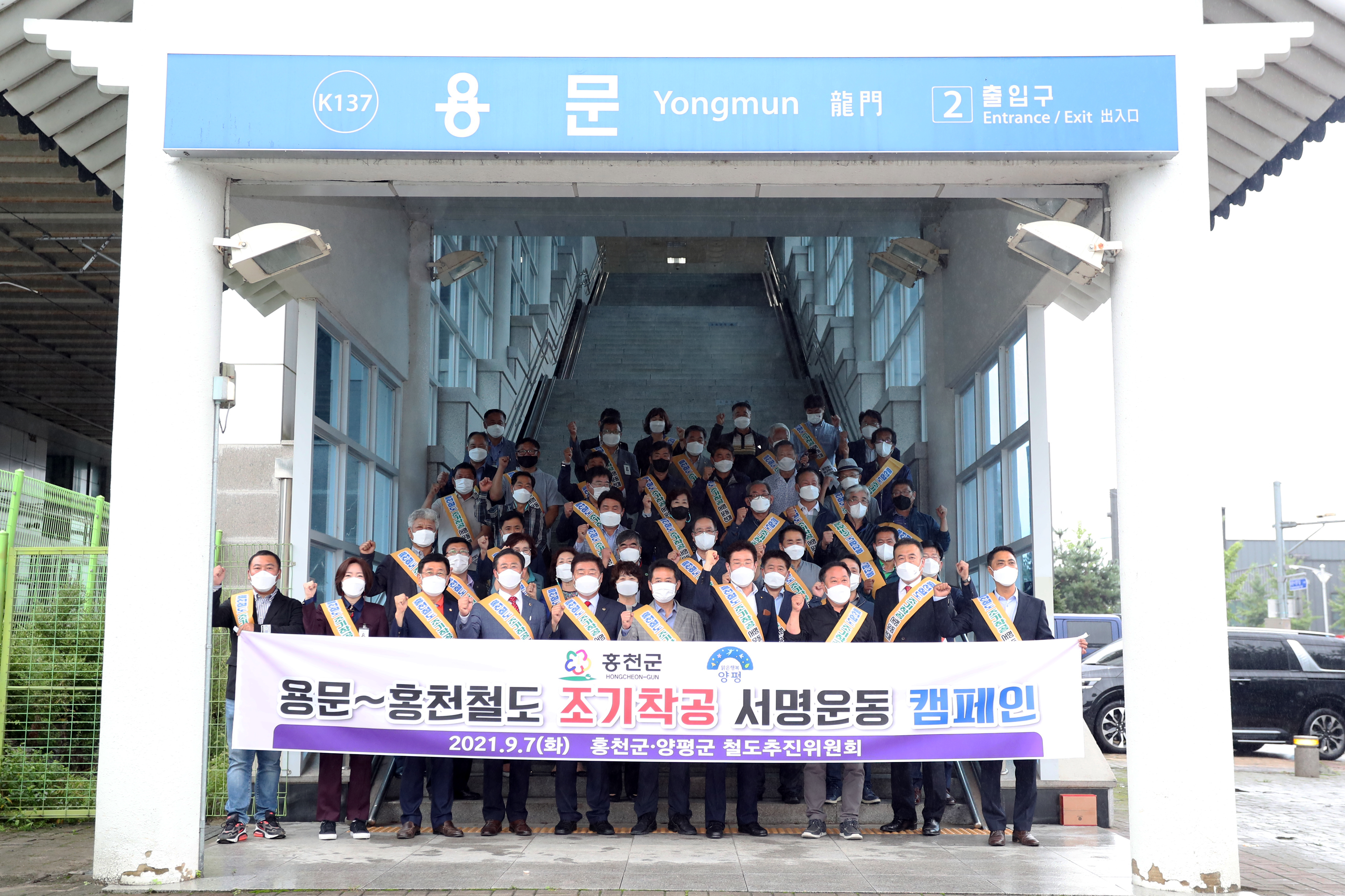 [강원사회복지신문 홍기한 기자]=홍천군 범군민추진위원회(위원장 이규설)는 양평군 철도추진위원회(위원장 장명우, 민문기, 이종각)와 공동으로 지난 9월 7일 양평군 용문역에서 용문~홍천철도 조기착공을 위한 서명운동 캠페인을 전개하였다. 이번 캠페인에는 허필홍 홍천군수와 정동균 양평군수, 도의원, 군의원, 철도추진...
