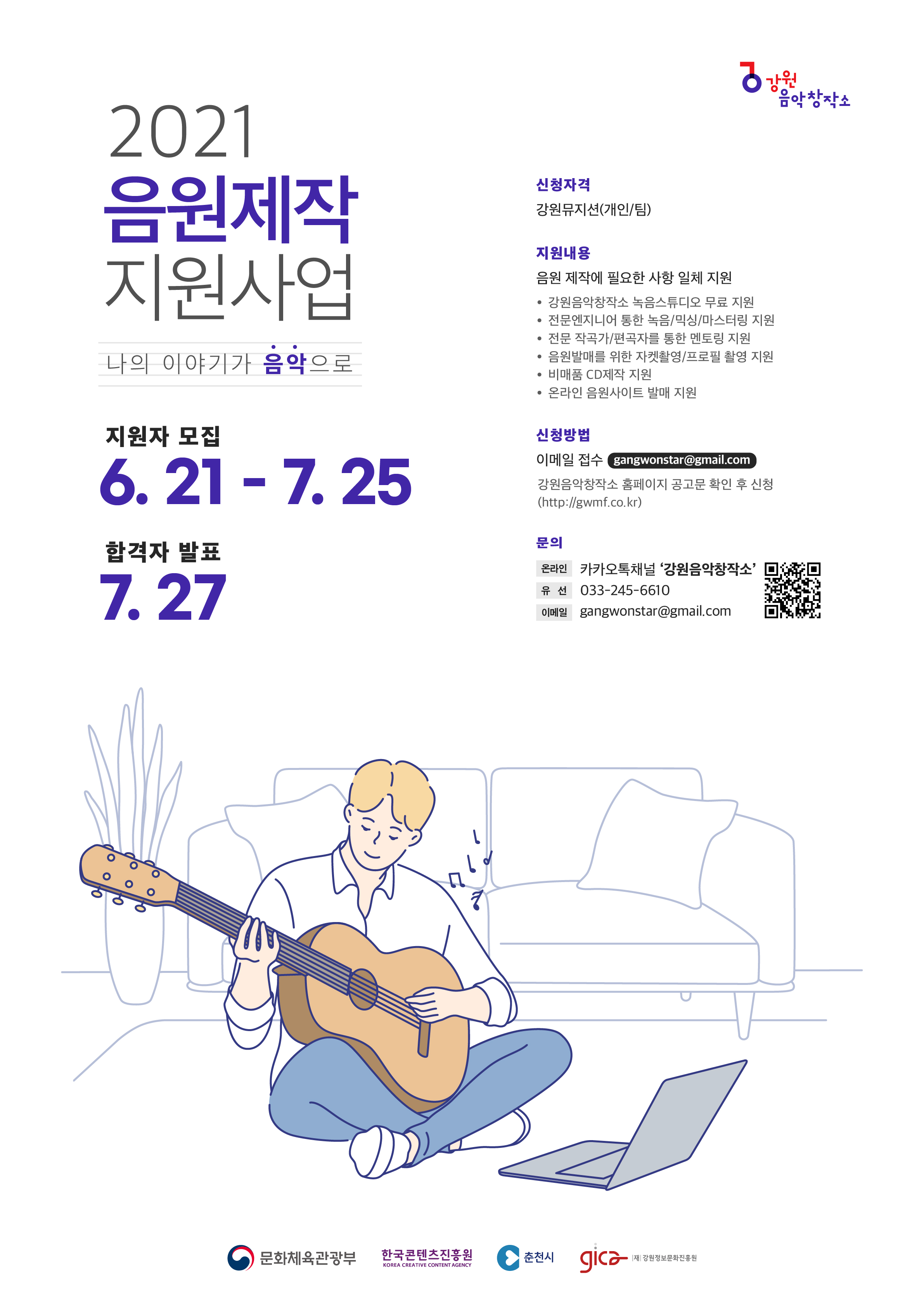 [강원사회복지신문 서은진 기자]=강원음악창작소가 오는 7월 25일까지 '2021 음원제작 지원사업'에 참가할 강원뮤지션을 모집한다. '2021 음원제작 지원사업'은 지역 음악인의 역량을 강화하고, 지역 음악 산업을 활성화시키기 위한 사업으로 자작곡을 보유한 강원뮤지션 5개 팀을 선정한다. 나의 이야기를 음악으로 풀어낼 ...