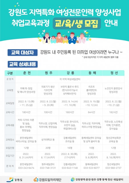 강원도 지역특화 여성전문인력 양성사업 취업교육과정 교육생 모집 안내