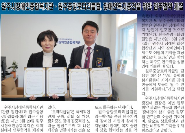 로타리클럽 소식-원주시장애인종합복지관·원주중앙로타리클럽, 장애인복지증진을 위한 업무협약 체결